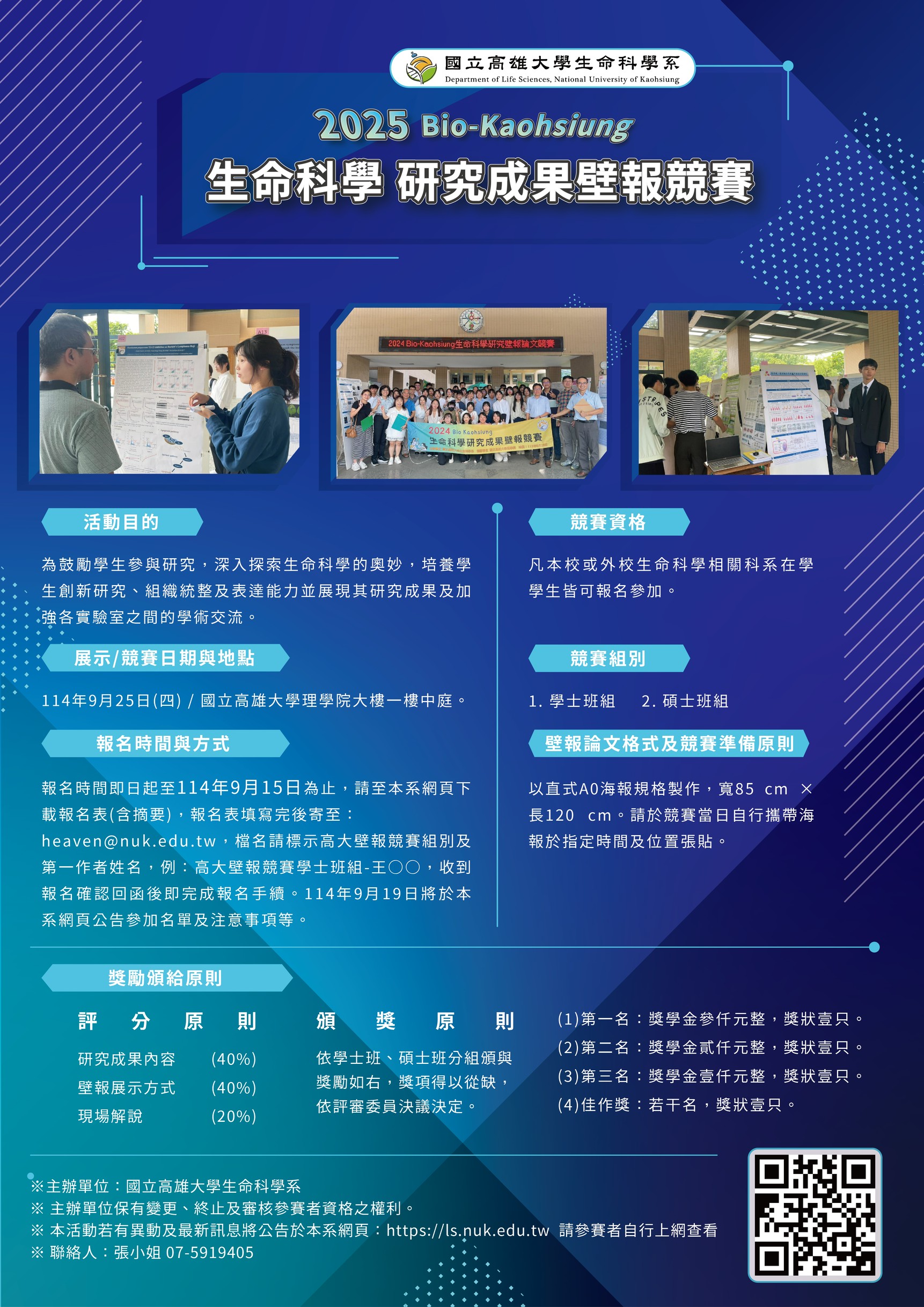 [活動訊息]國立高雄大學生命科學系 2025 Bio-Kaohsiung生命科學研究壁報論文競賽