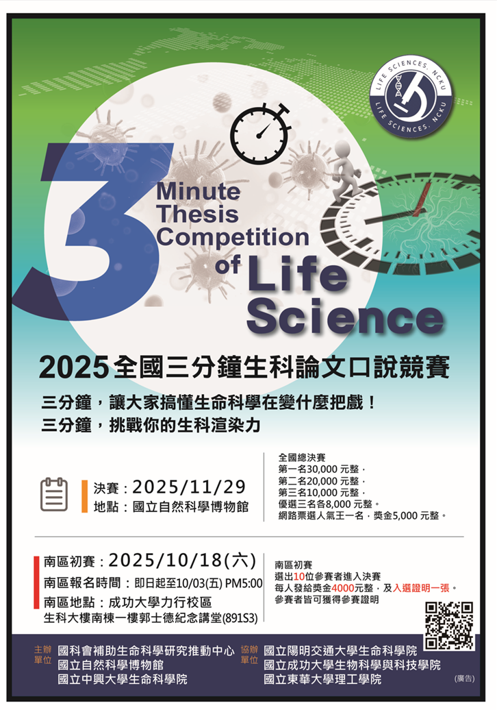 2025全國三分鐘生科論文口說競賽(南區預賽) 即日起開始報名!