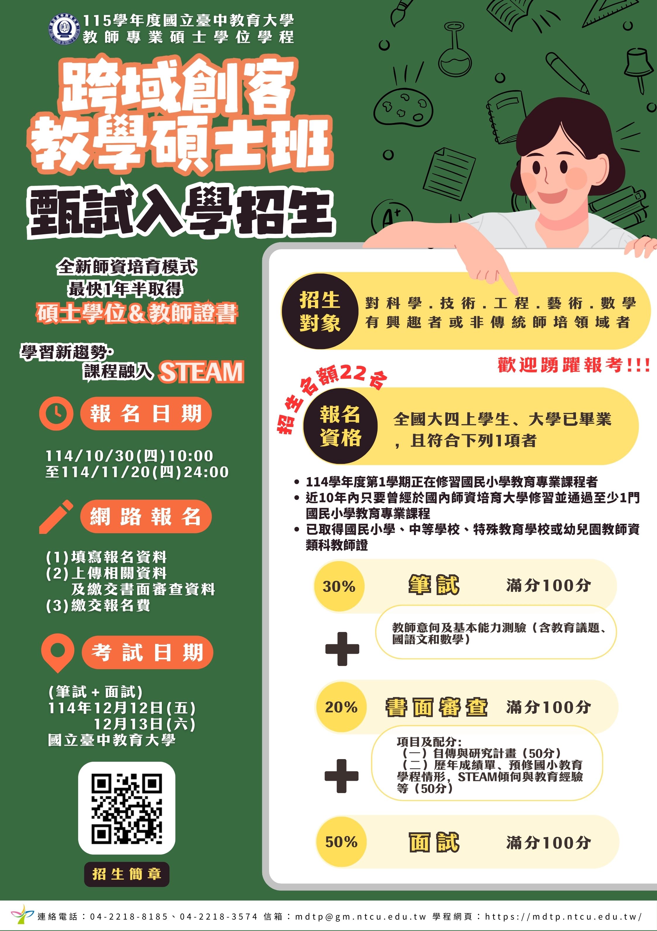 • 檔案: 國立臺中教育大學 115學年度教師專業碩士學位學程(跨域創客 教學班)甄試入學招生
