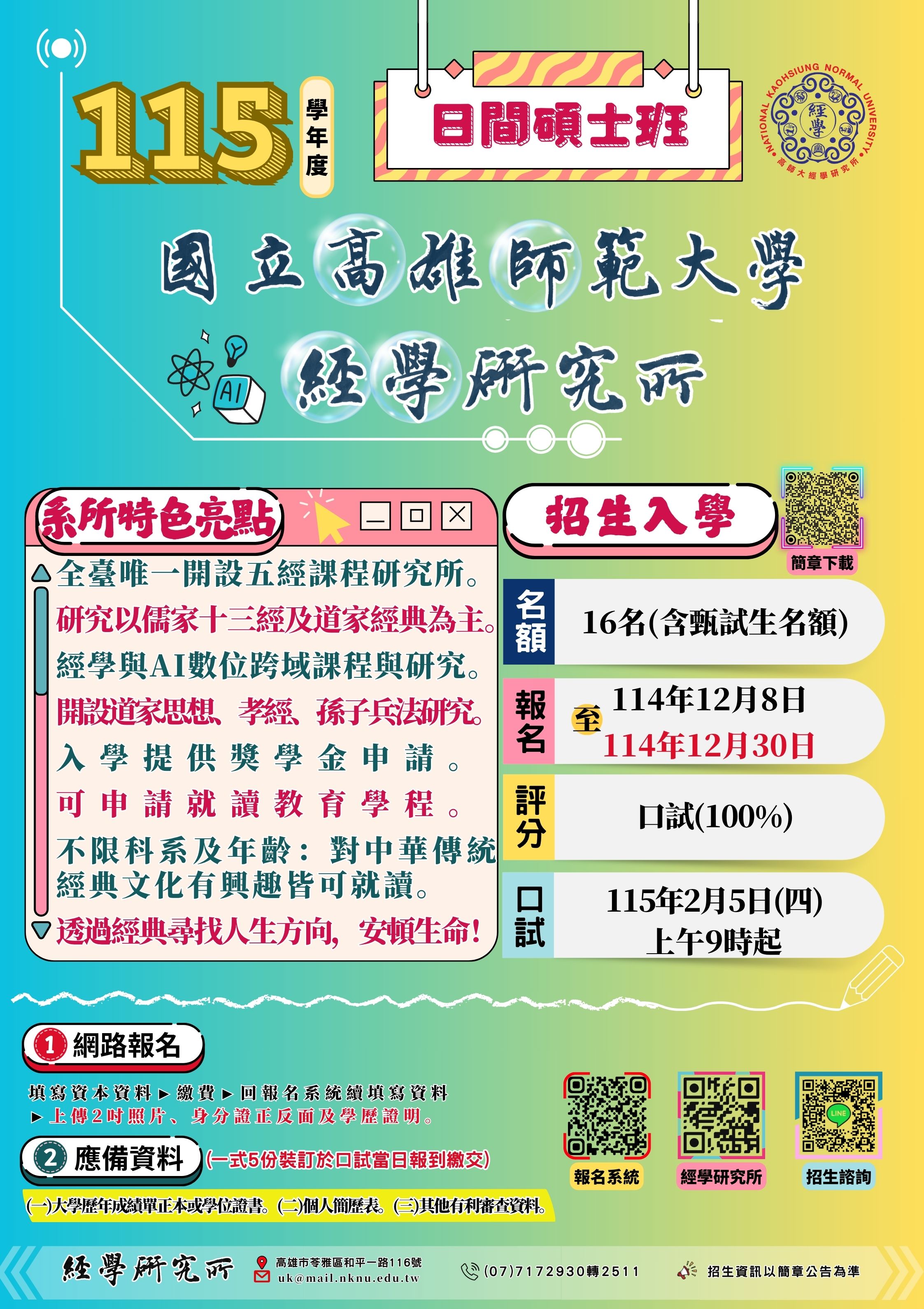 一、國立高雄師範大學經學研究所簡介:開設儒家十三經專業課程的碩士研究所,結合傳統經典與當代思維,深入探索儒家十三經與道家經典的智慧,招生不限科系,歡迎報考。