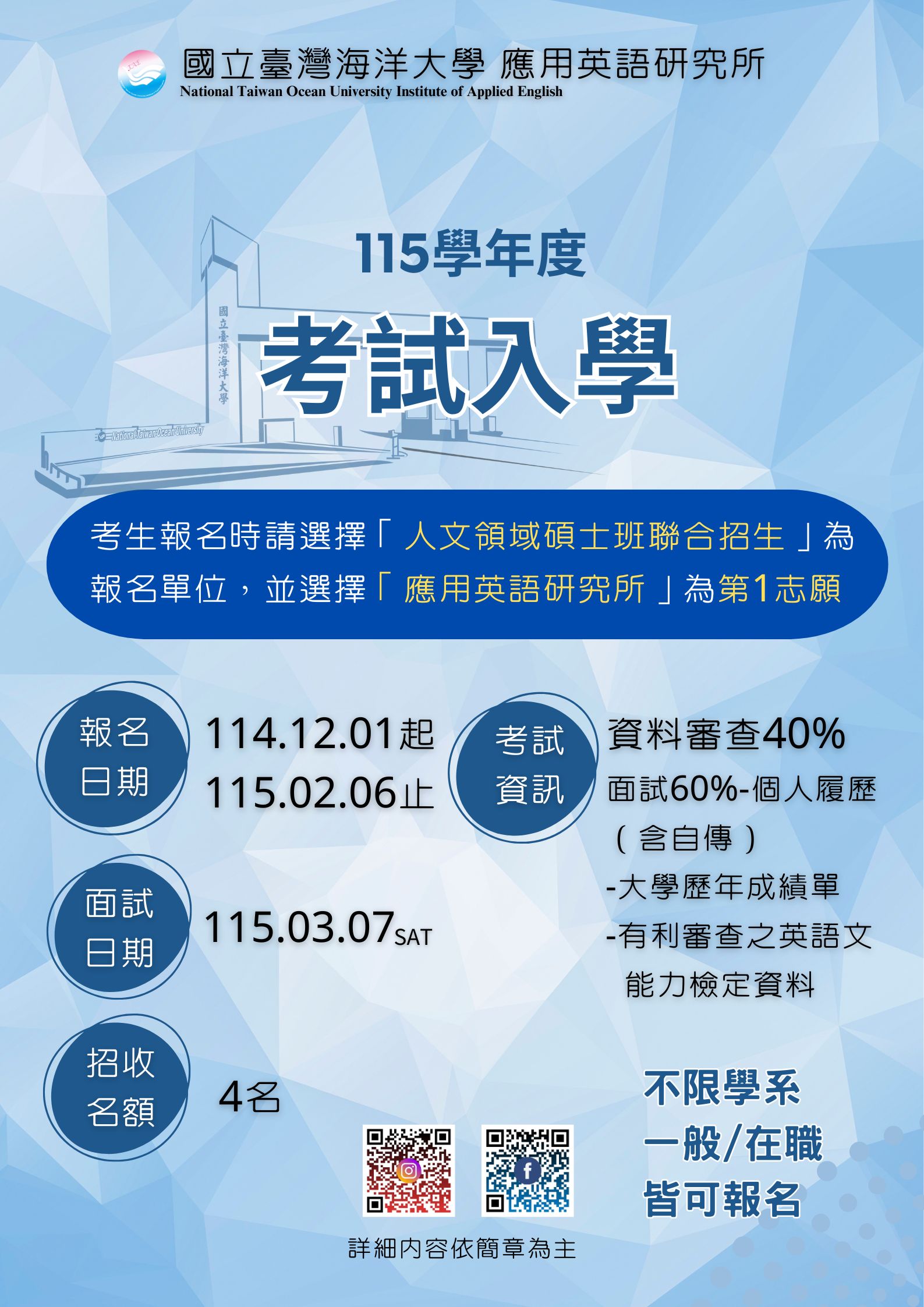 國立臺灣海洋大學 115學年度應用英語研究所碩士班考試報名