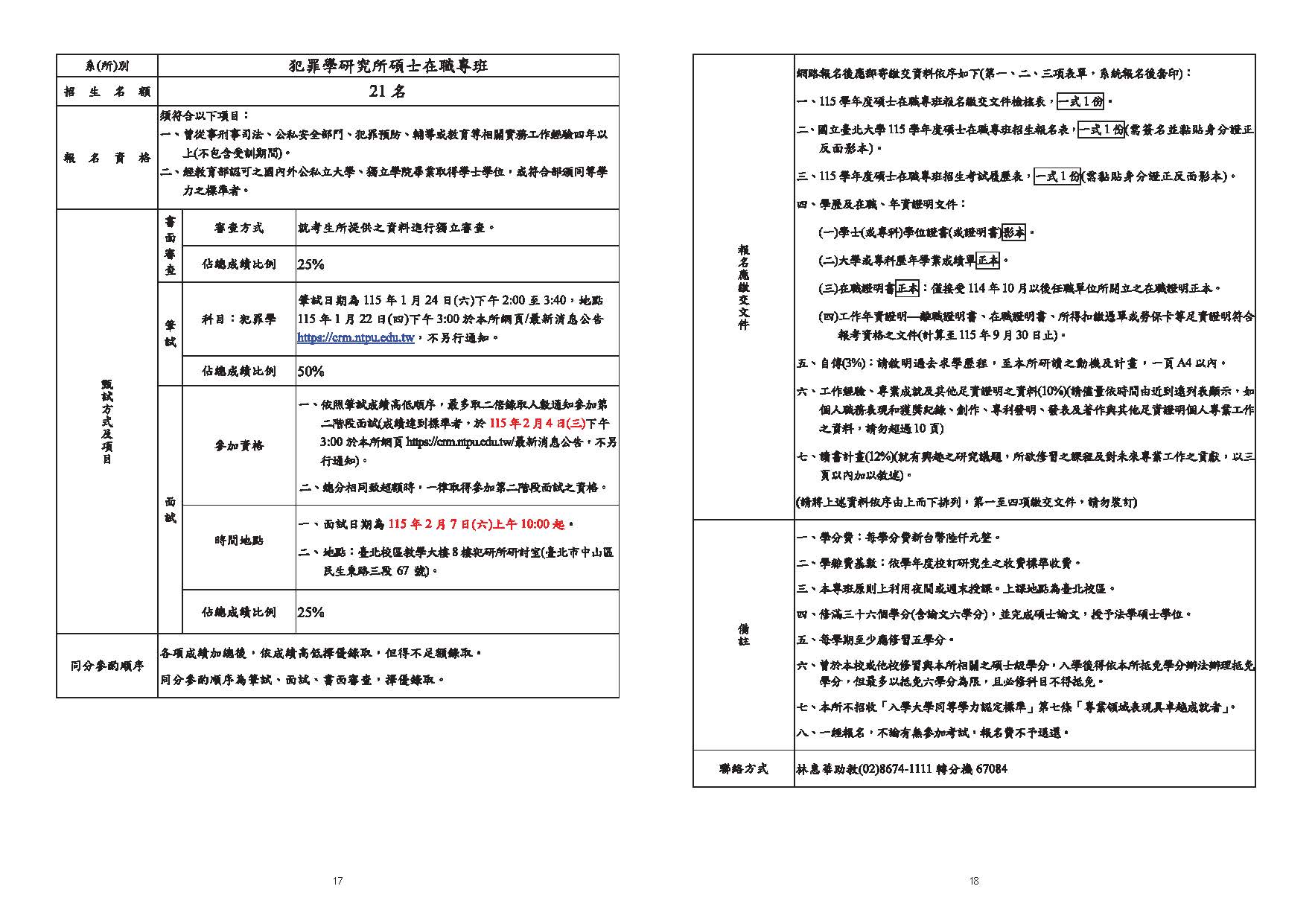 一、國立臺北大學犯罪學研究所115學年度碩士在職專班招生名額21名,簡章已公告https://new.ntpu.edu.tw/admission/ntpu,請考生自行下載列印。