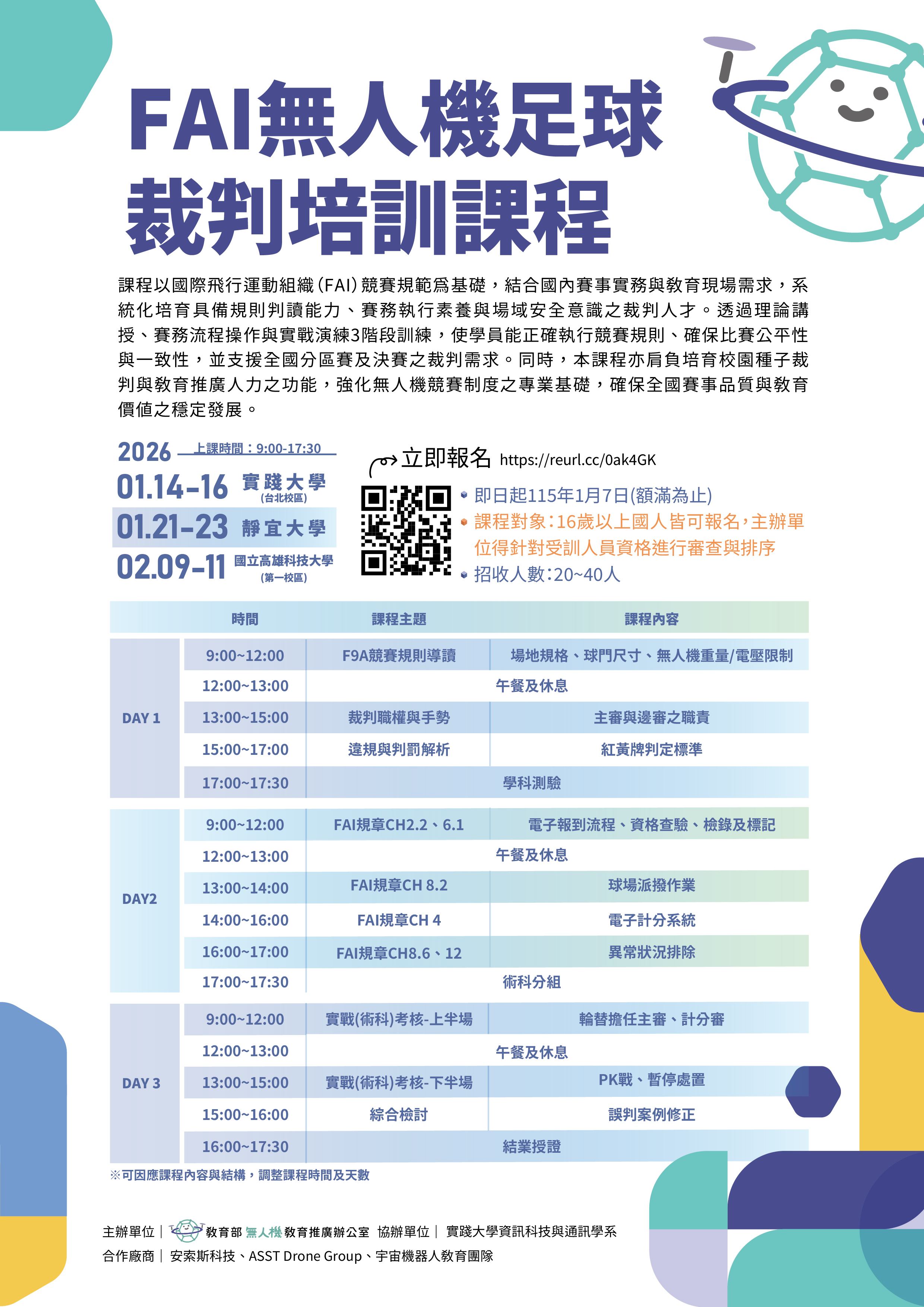 一、課程主旨在培育校園種子裁判與教育推廣人力之功能,強化無人機競賽制度之專業基礎,確保全國賽事品質與教育價值之穩定發展。
