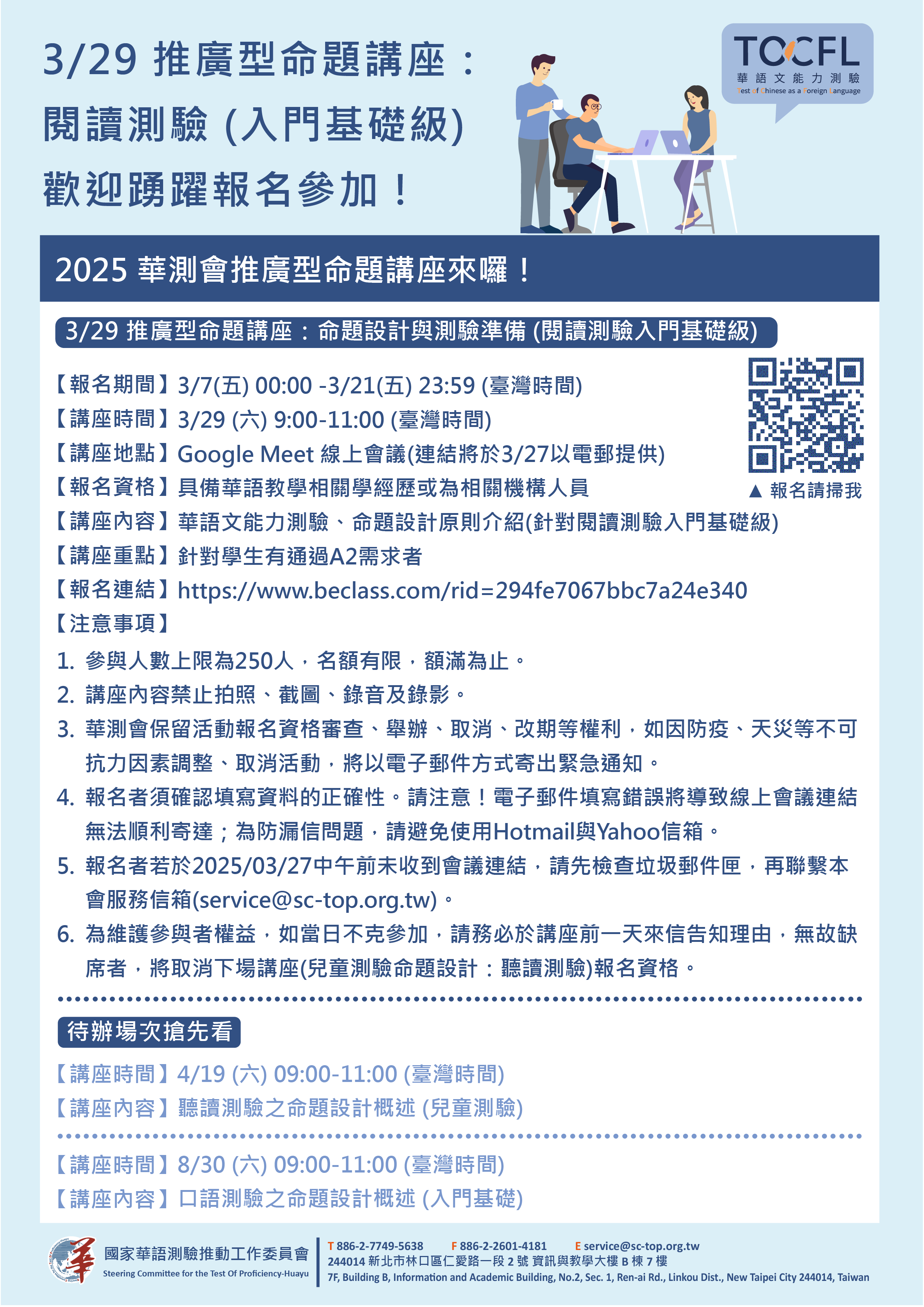 【轉知】國家華語測驗推動工作委員會函告於2025年3月29日舉辦華語文能力測驗「推廣型命題講座:閱讀測驗(入門基礎級)」