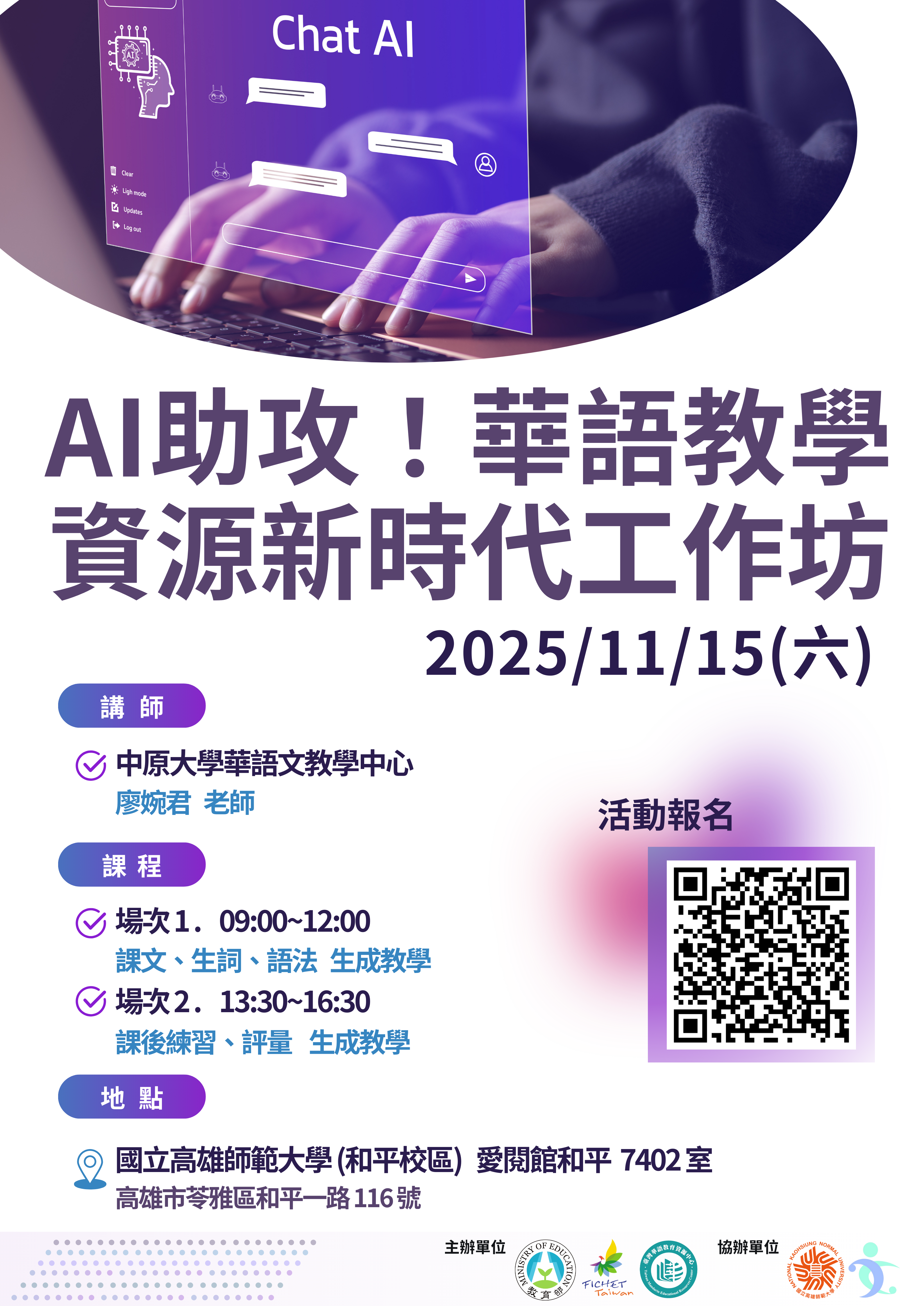 【轉知】財團法人高等教育國際合作基金會函告該會舉辦「AI助攻!華語教學資源新時代工作坊」高雄場
