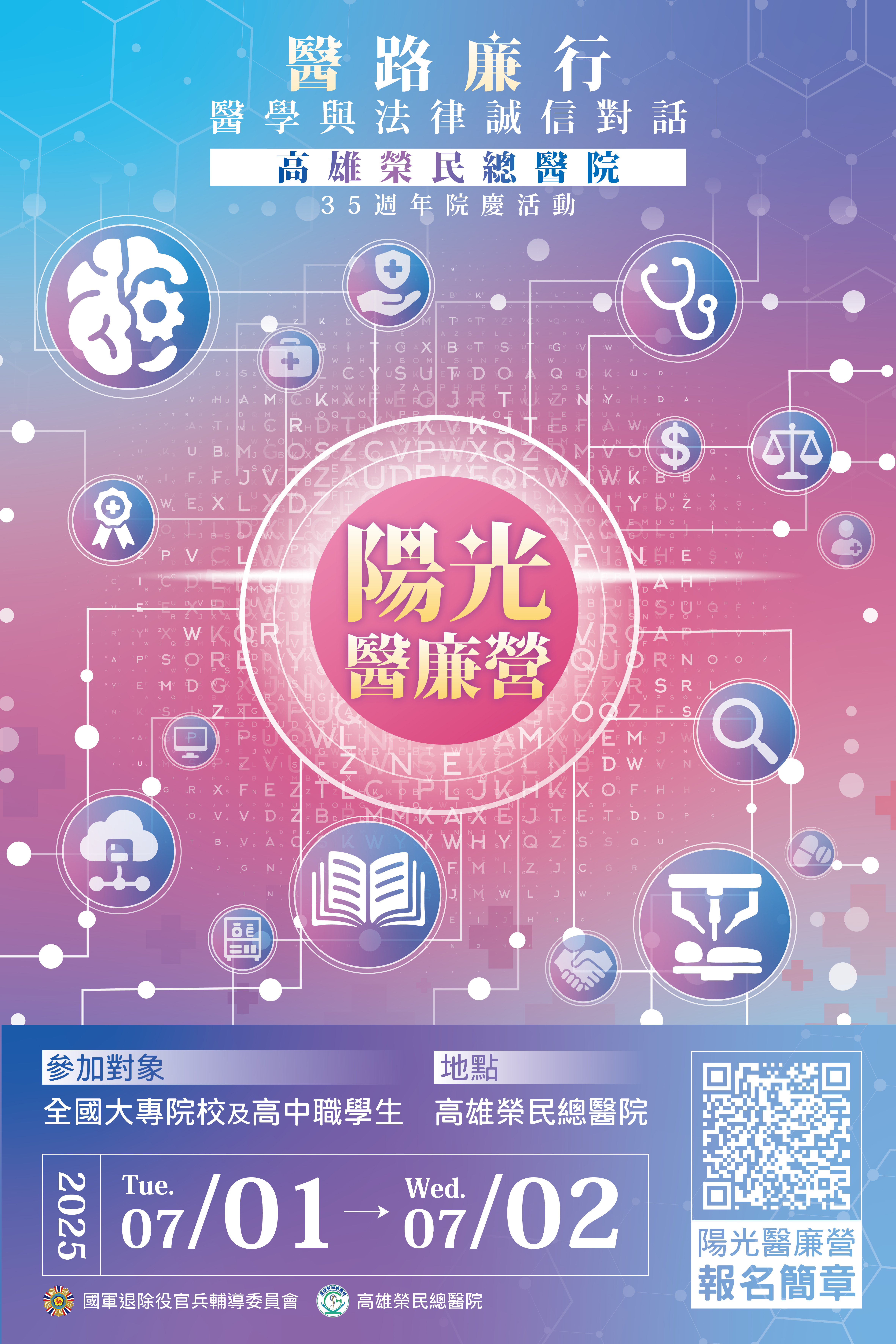 主旨:高雄榮民總醫院訂於114年7月1日至7月2日辦理陽光醫廉營,有助提升學生對醫學及法律之認識,請轉知貴校學生踴躍報名參加,請查照。