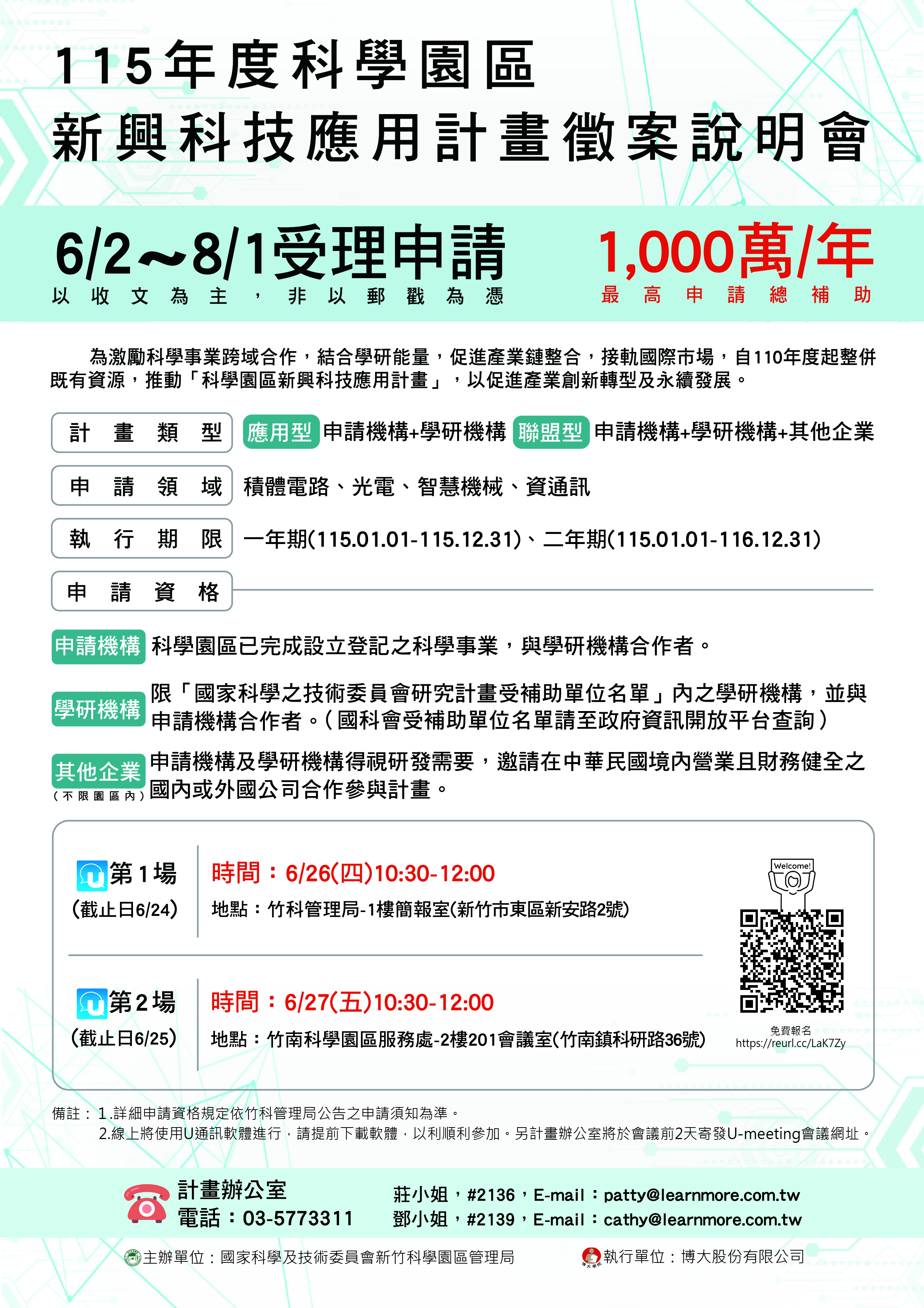 本局訂於114年6月26、27日舉辦115年度「科學園區新興科技應用計畫徵案說明會」,歡迎貴單位踴躍報名參加,請查照。