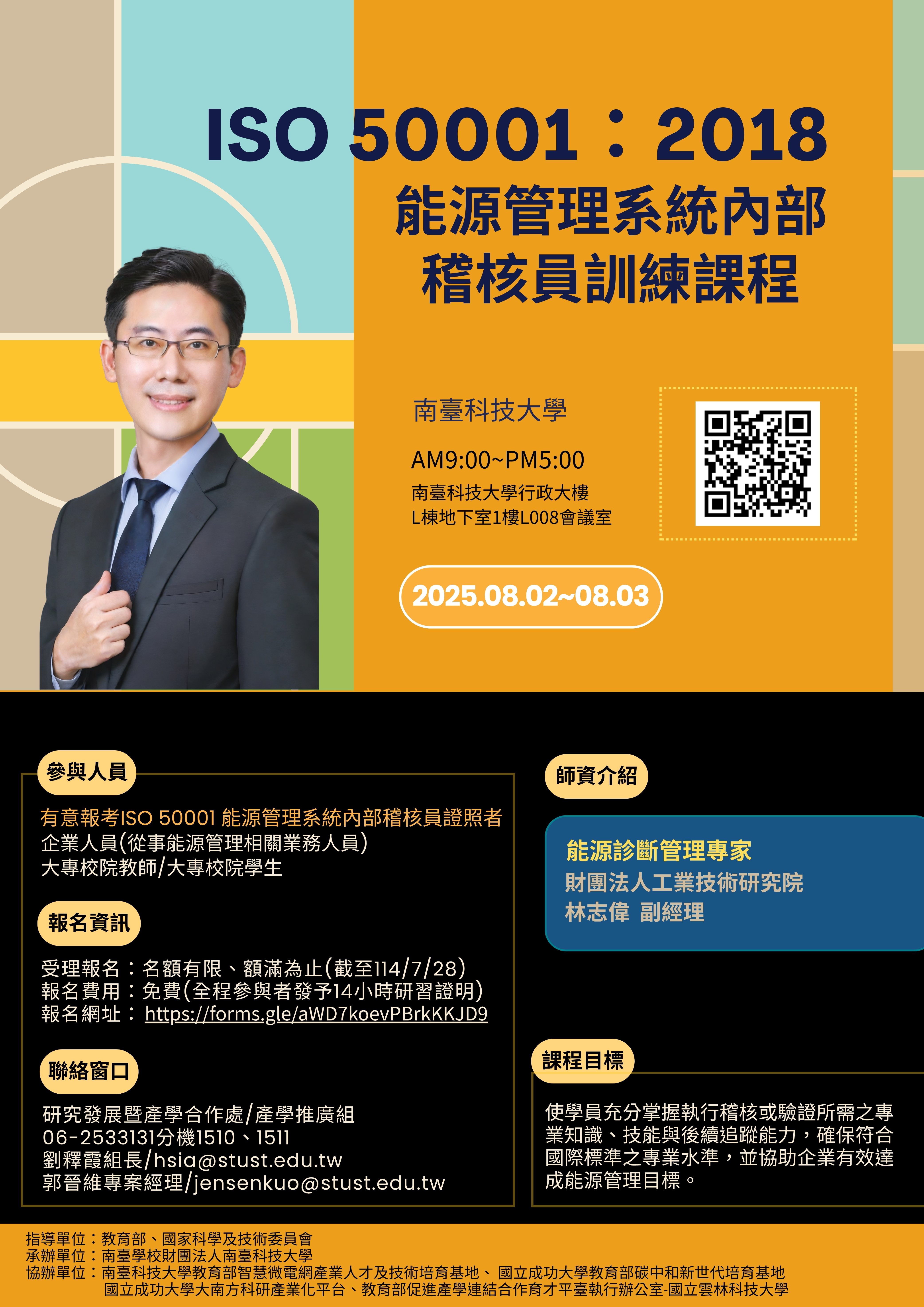 有關本校推動教育部育才平臺任務四提升教師實務增能,協助辦理南臺科技大學2025「ISO 50001:2018 能源管理系統內部稽核員訓練課程」,敬邀貴校教師參與並請協助公告,請查照。