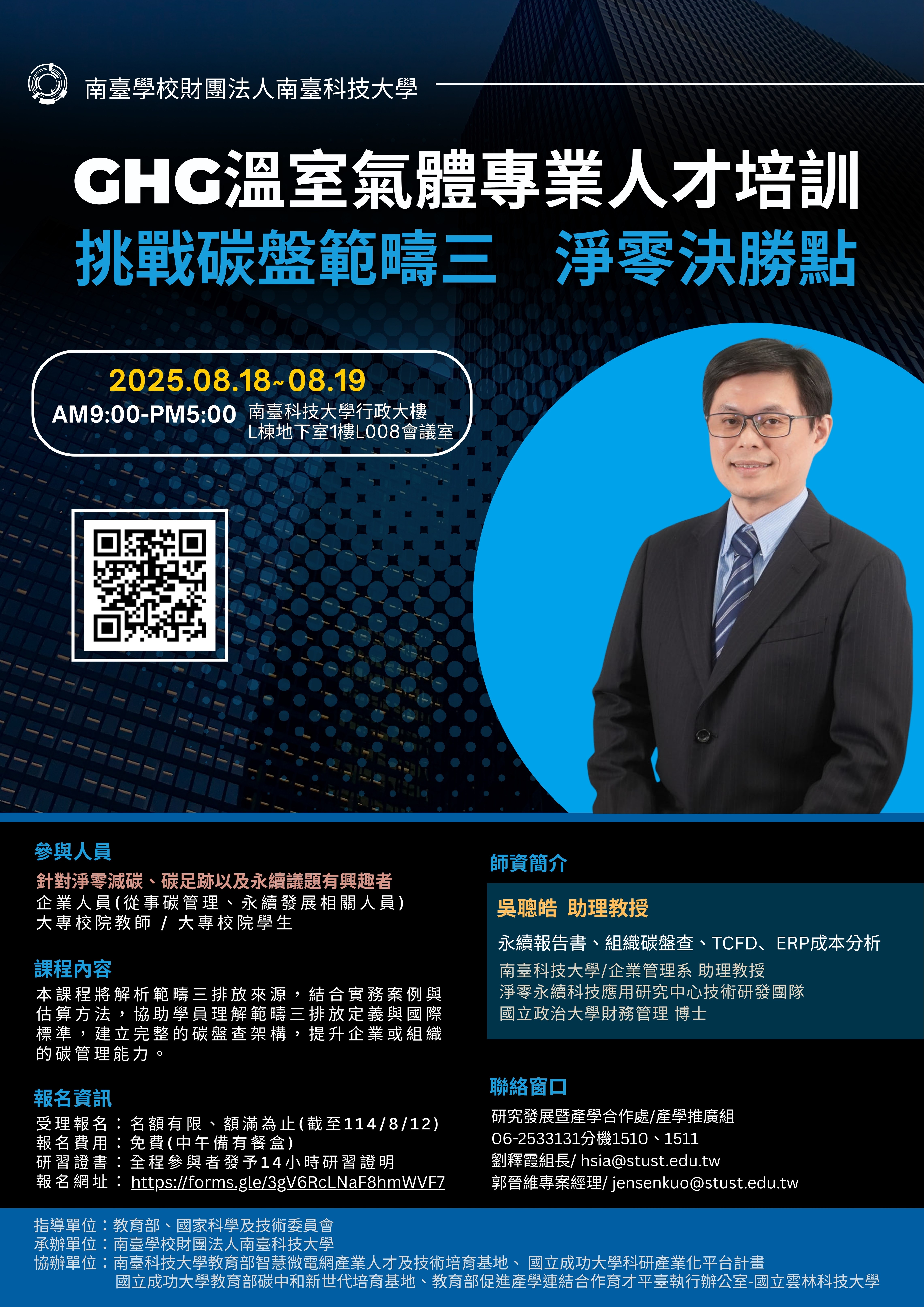 有關本校推動教育部育才平臺任務四提升教師實務增能,協助辦理南臺科技大學「GHG溫室氣體專業人才培訓:挑戰碳盤範疇三、淨零決勝點」,敬邀貴校教師參與並請協助公告,請查照。