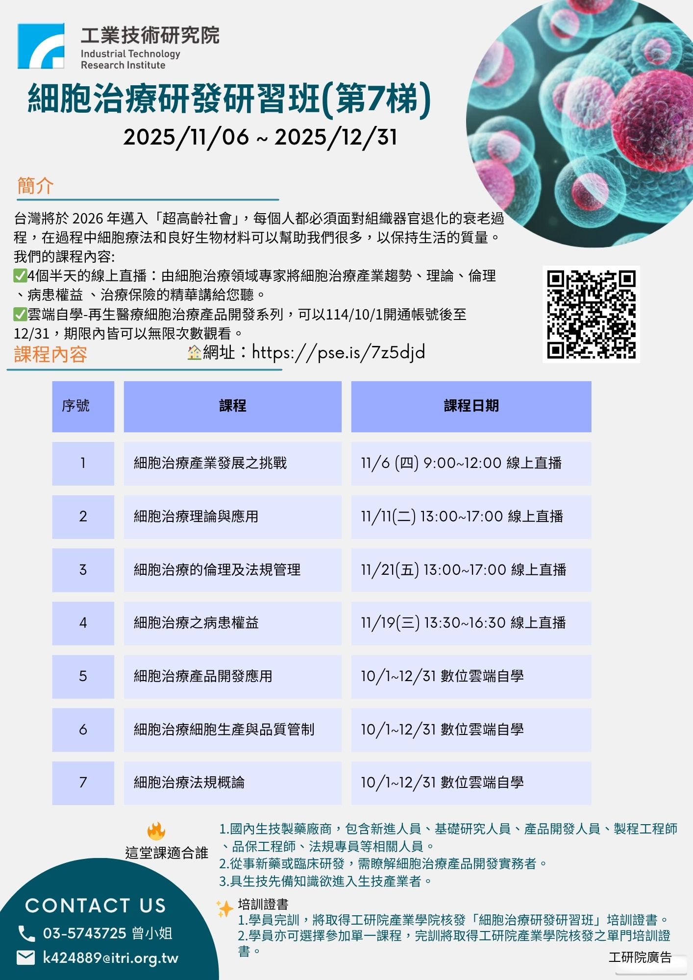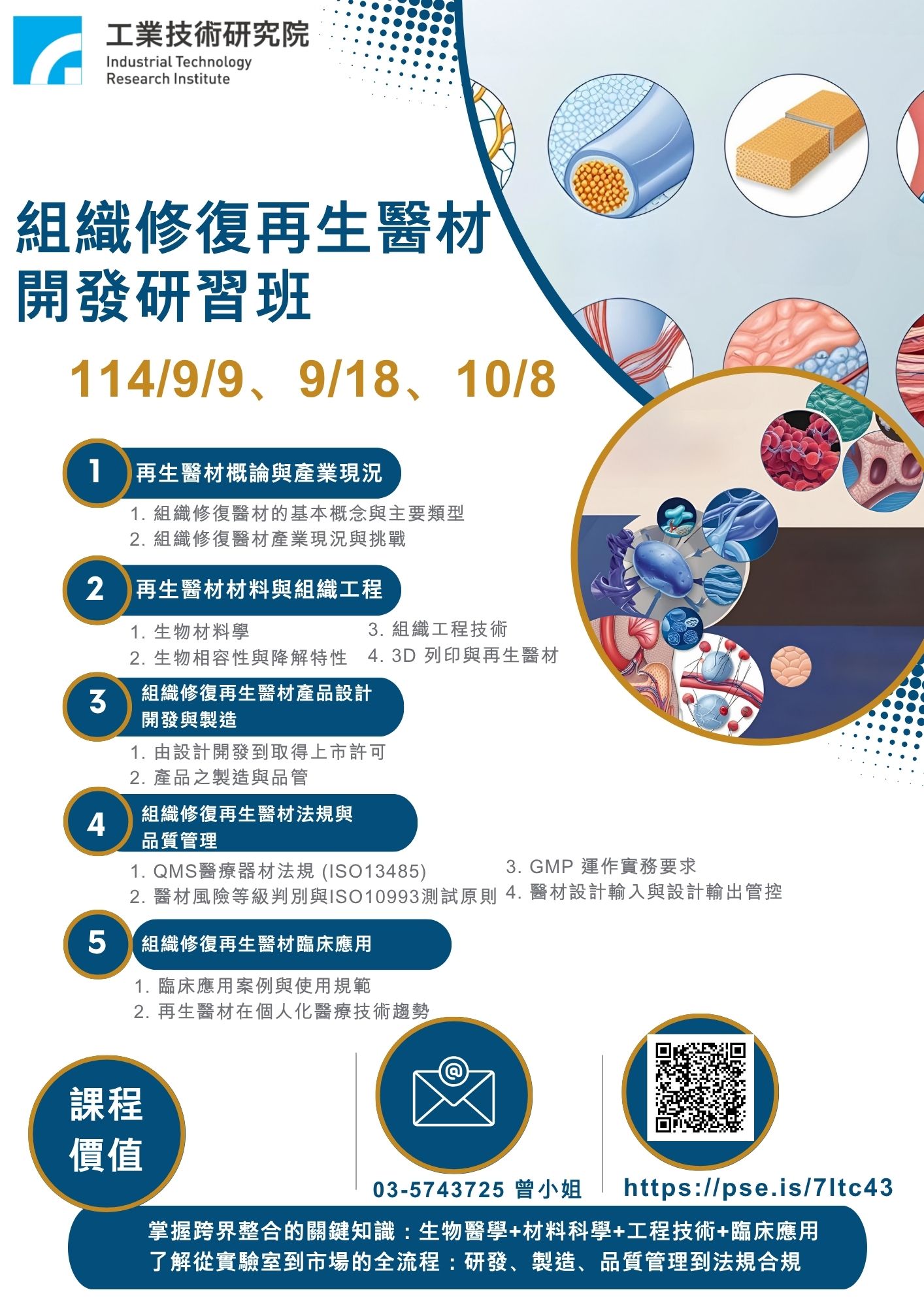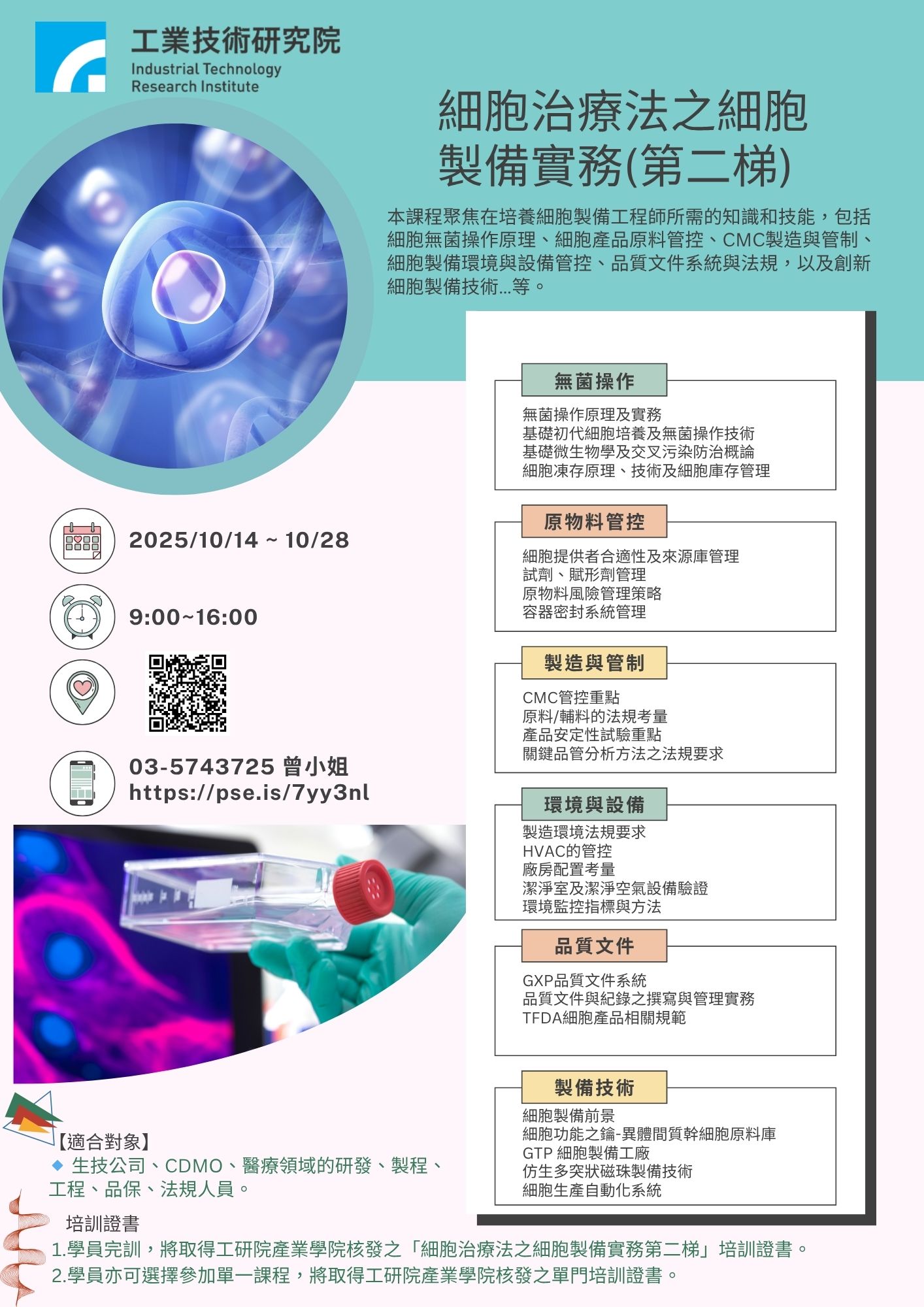一、為培訓再生醫療產業所需之專業人才,本院擬於114年9月9日起舉辦再生醫療專業課程:組織修復再生醫材開發研習班、細胞治療法之細胞製備實務第二梯、細胞治療臨床試驗設計與數據分析、細胞治療研發研習班(第7梯),課程簡章如附。