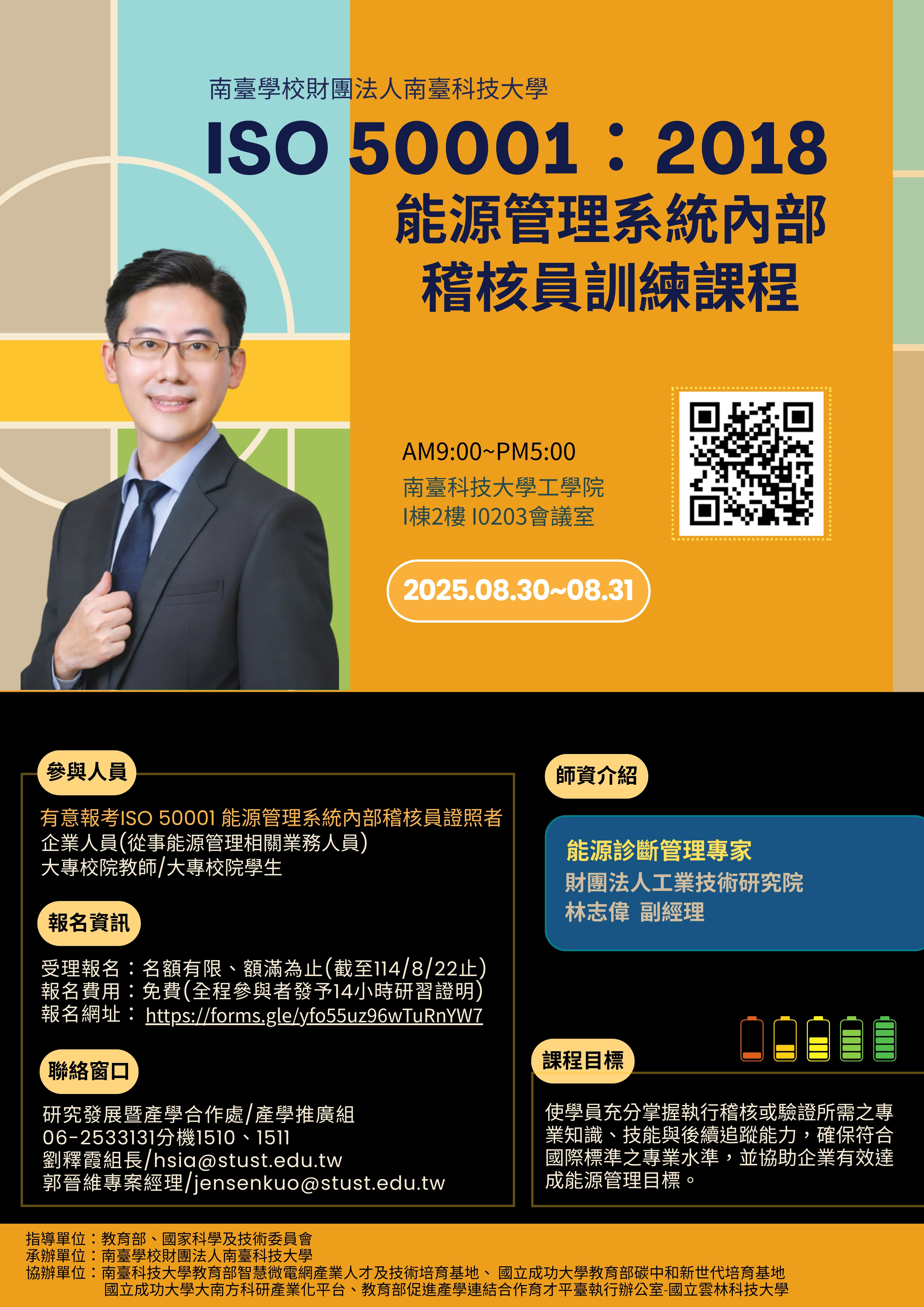 有關本校推動教育部育才平臺任務四提升教師實務增能,協助辦理南臺科技大學2025「ISO 50001:2018 能源管理系統內部稽核員訓練課程」,敬邀貴校教師參與並請協助公告,請查照。