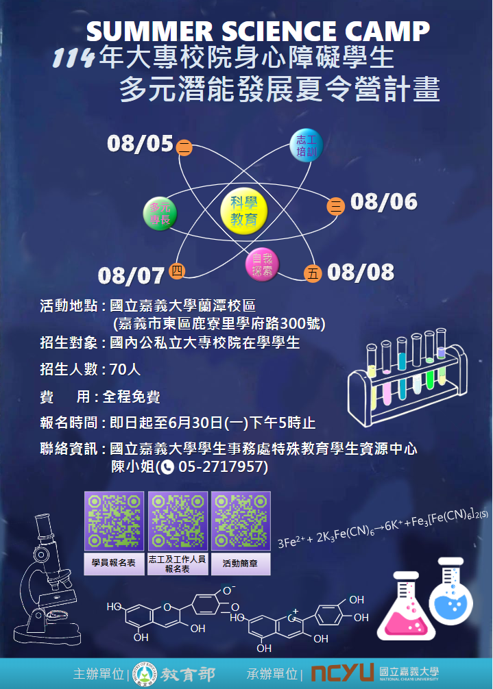 【轉知】教育部委託國立嘉義大學辦理「114年大專校院身心障 礙學生多元潛能發展夏令營」簡章及海報