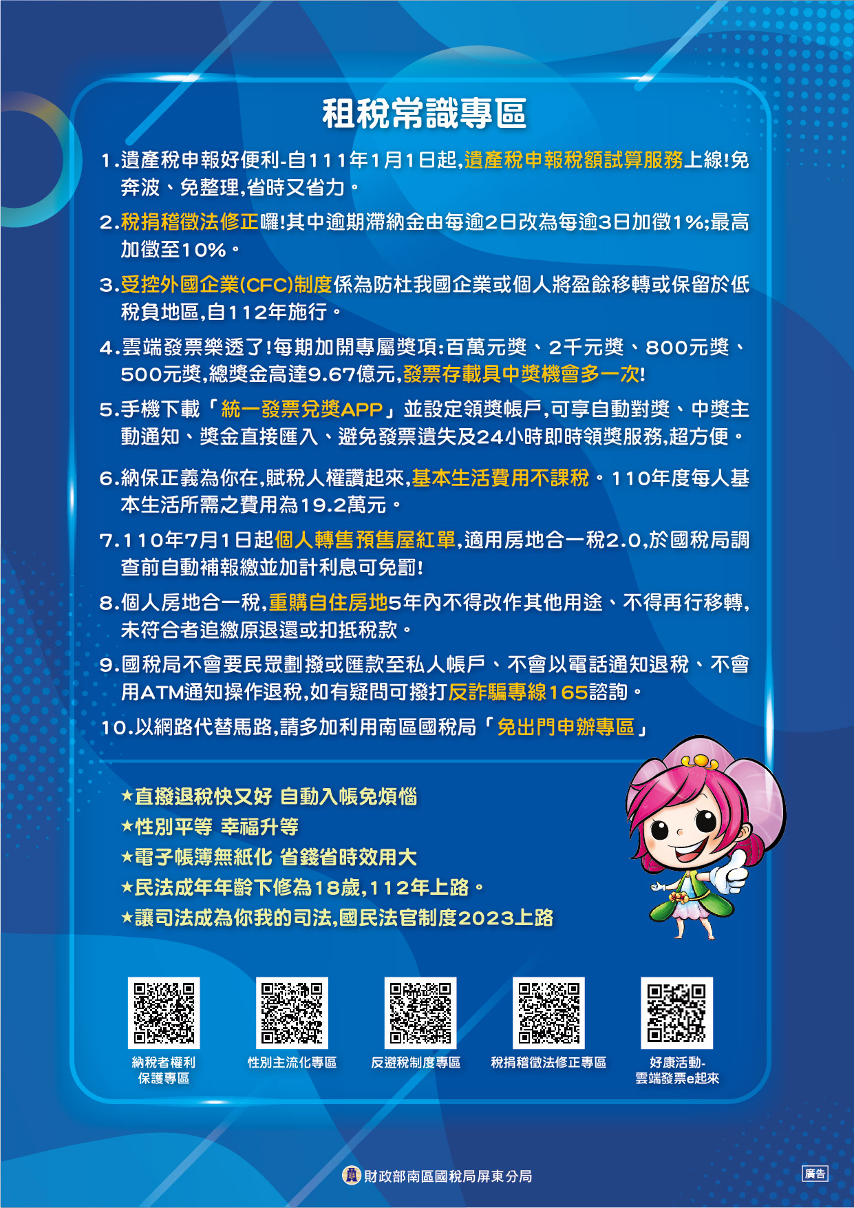 五、詳情請上本局官網(https://www.ntbsa.gov.tw)宣導活動或本局FB粉絲專頁「南區國稅局」查詢。