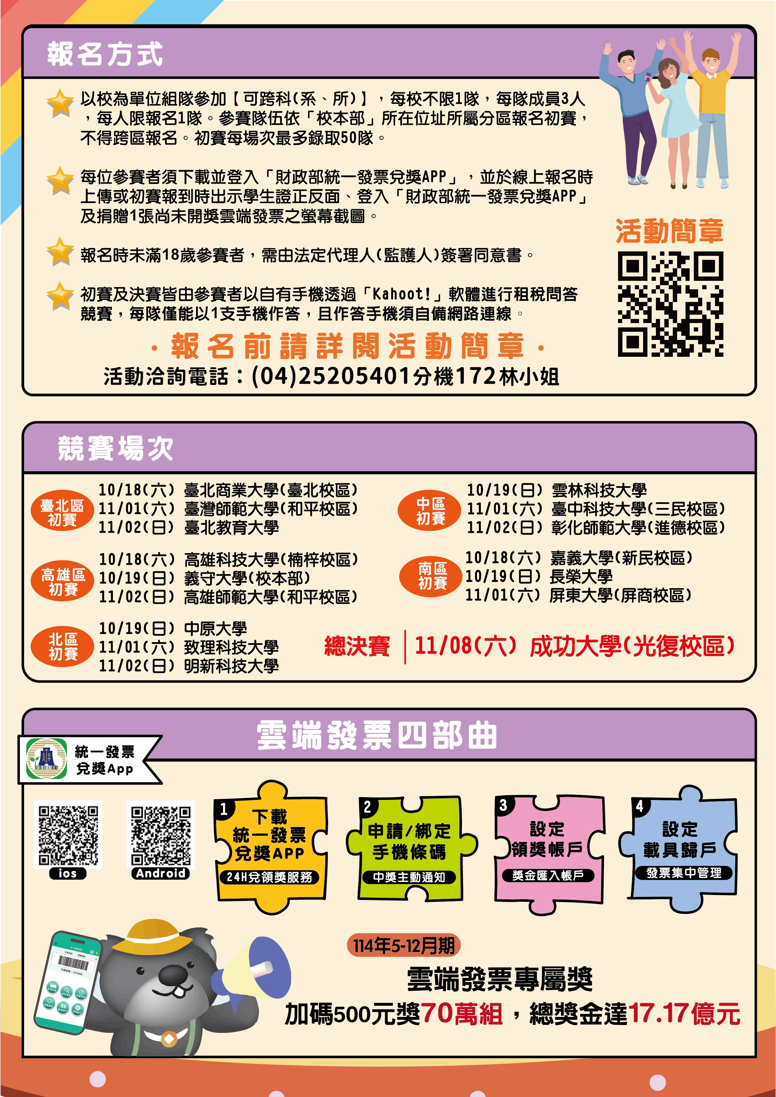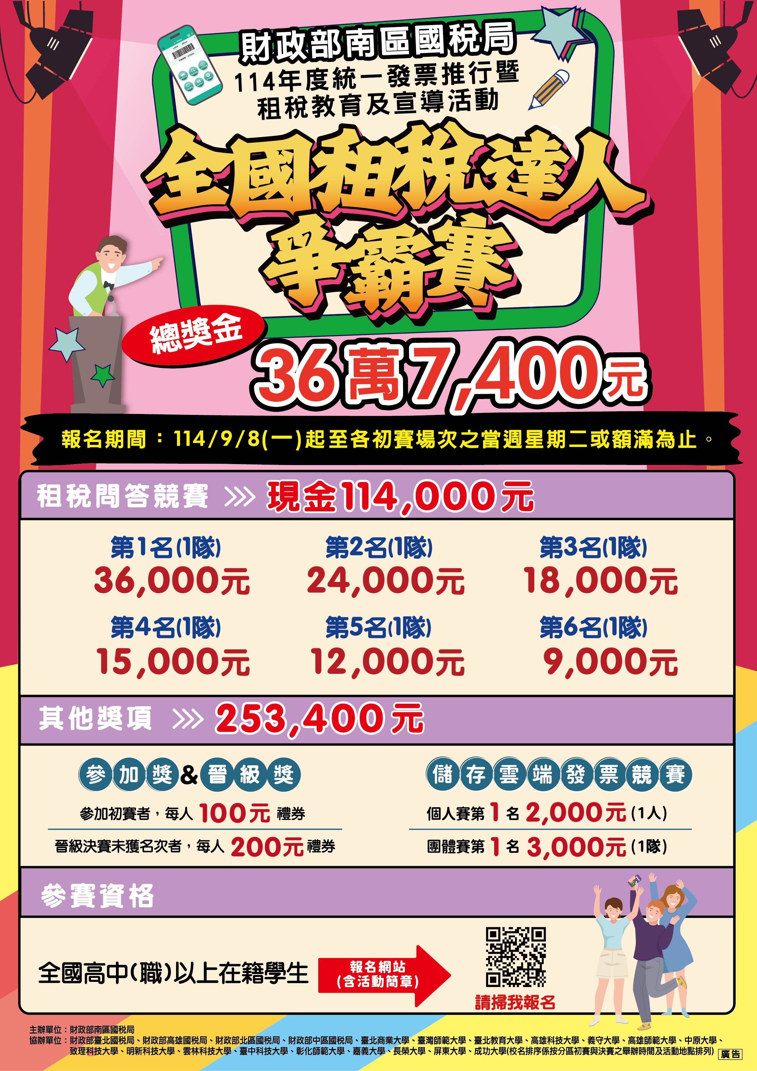 (轉知)財政部南區國稅局 辦理 114年度統一發票推行暨「全國租稅達人爭霸賽」租稅教育及宣導活動,歡迎同學踴躍報名參加。