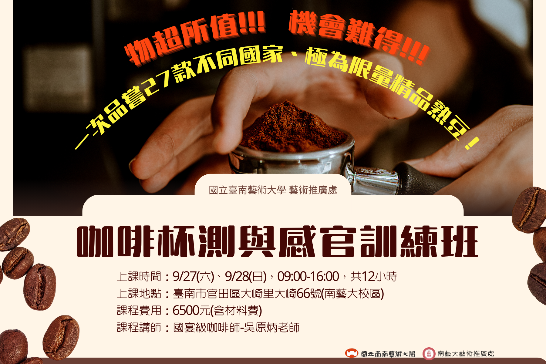 (轉知)國立臺南藝術大學 辦理 「咖啡杯測與感官訓練班」,歡迎同學踴躍報名參加。