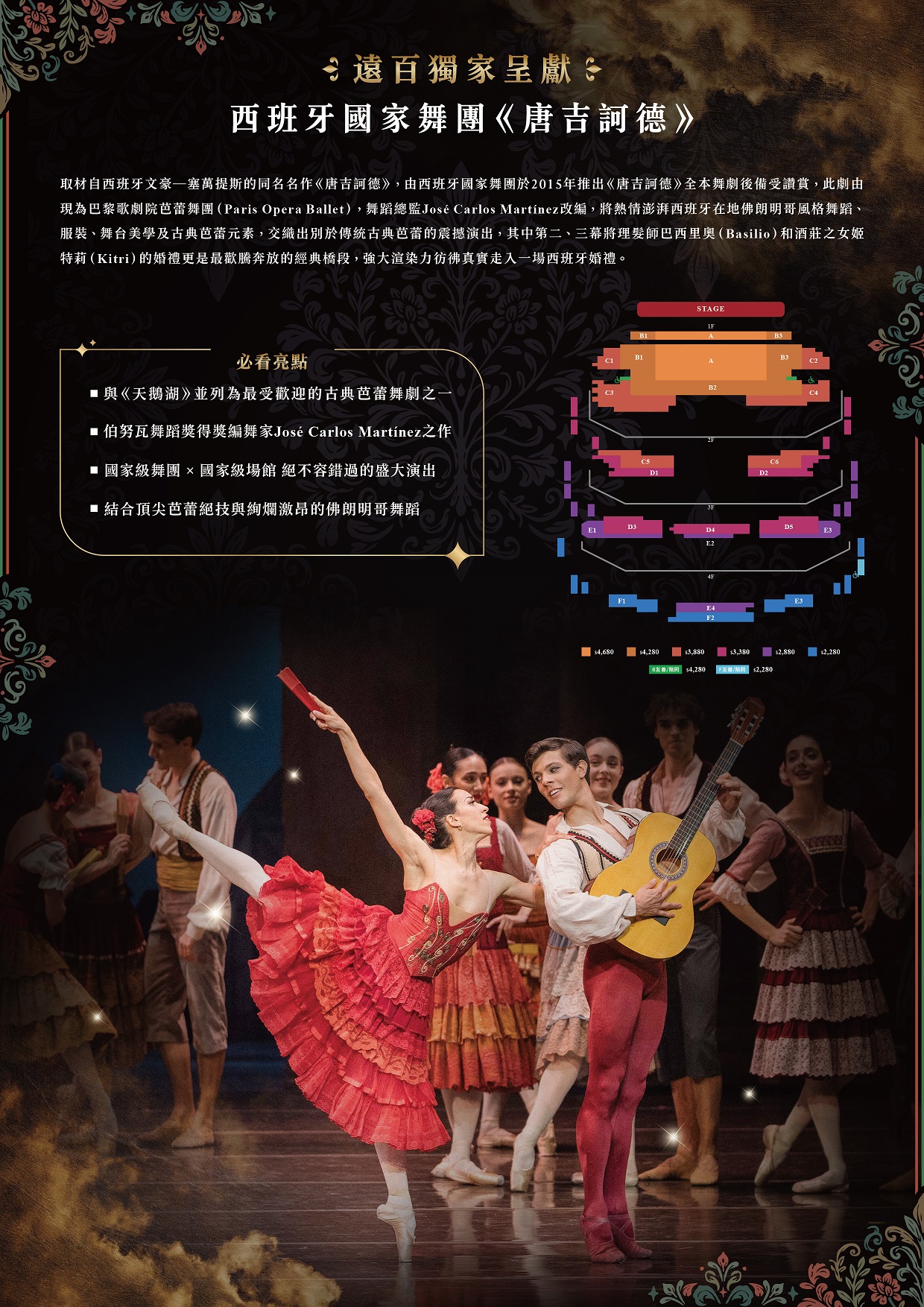 (五)本次演出版本由現任巴黎歌劇院芭蕾舞團舞蹈總監、伯努瓦舞蹈獎(Benois de la Danse)得主 José Carlos Martínez 改編創作。Martínez 以19世紀「古典芭蕾之父」莫里斯.佩蒂帕(Marius Petipa)的經典版本為基礎,在尊重古典技術體系與結構框架的前提下,融入更鮮明的西班牙文化元素,使人物性格更加立體,並透過舞段節奏與場景轉換的流動設計,讓敘事更為緊湊而富層次。