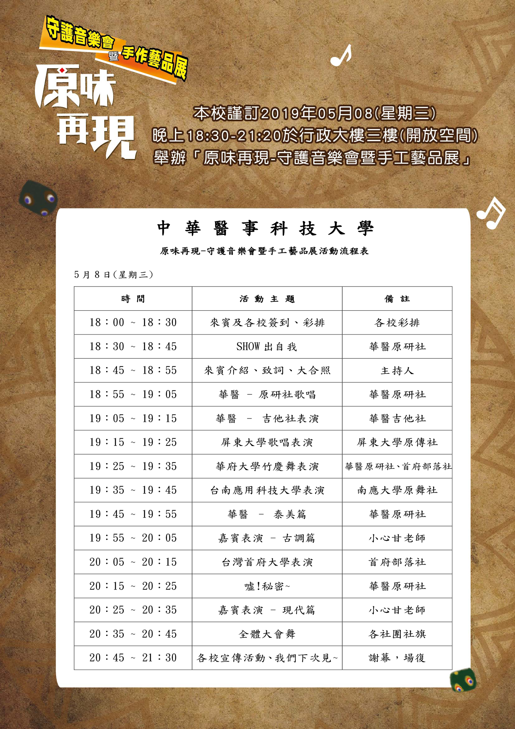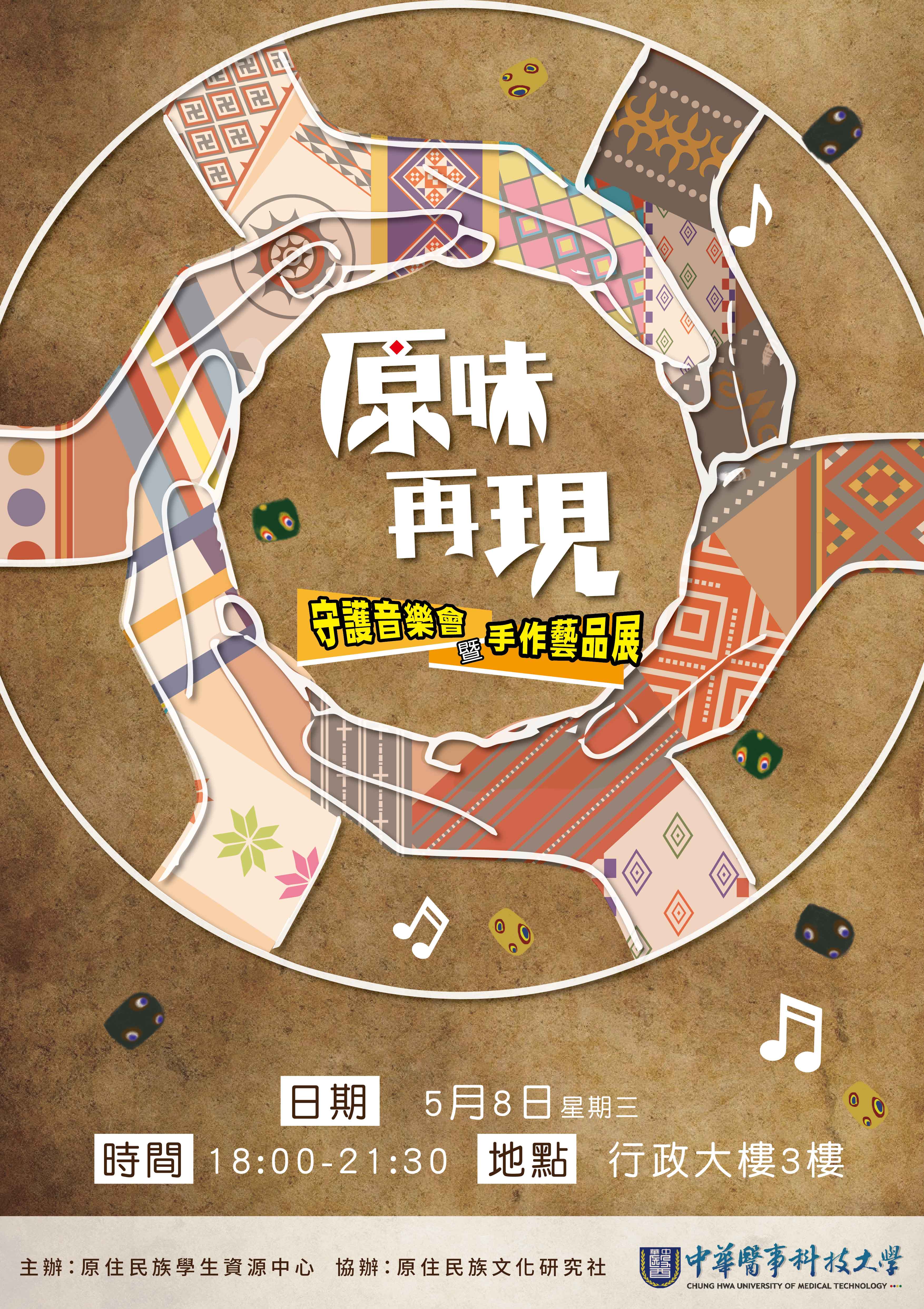 中華醫事科技大學108年5月8日(星期三)舉辦原味再現-守護音樂會暨手工藝品展,歡迎學生及社團踴躍參加。