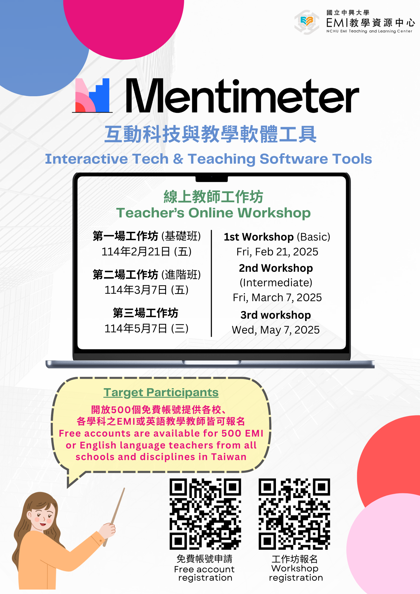 國立中興大學辦理「國立中興大學EMI教學資源中心 :互動科技與教學軟體工具專案」及「Mentimeter for Formative Assessments」教師工作坊