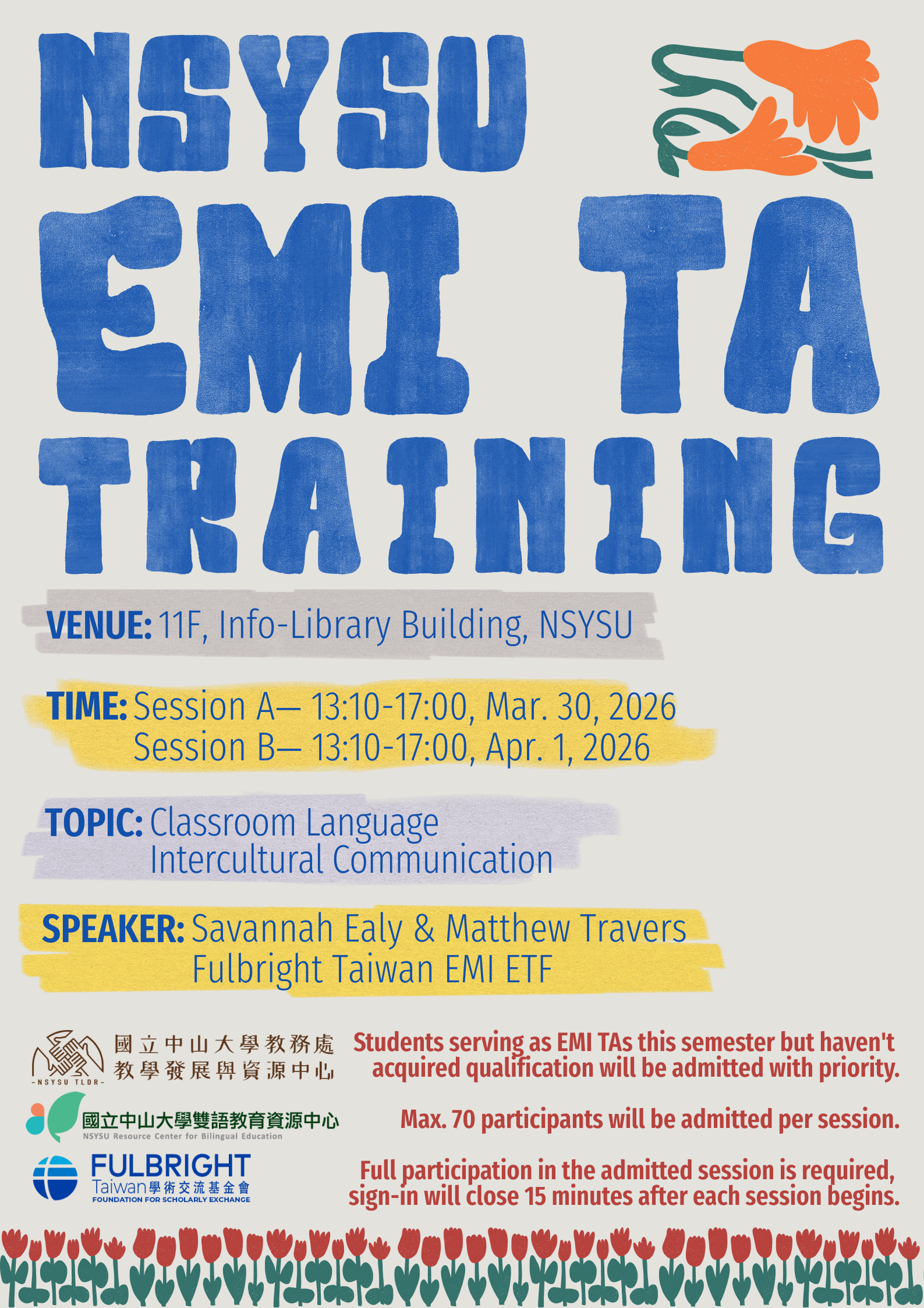 國立中山大學雙語教育資源中心辦理「114-2學期EMI 教學助理培訓課程」。