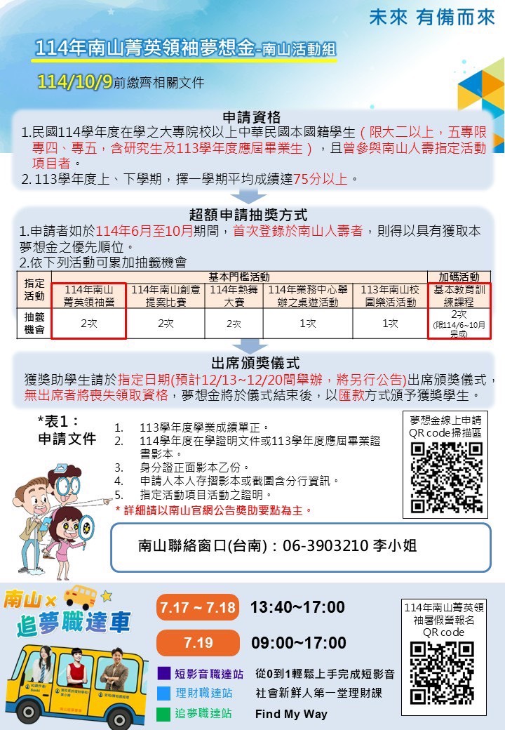 2.114年相關活動加分項目:113年間曾參與南山相關活動或熱心公益服務或社團者,歡迎參與南山菁英領袖暑假營