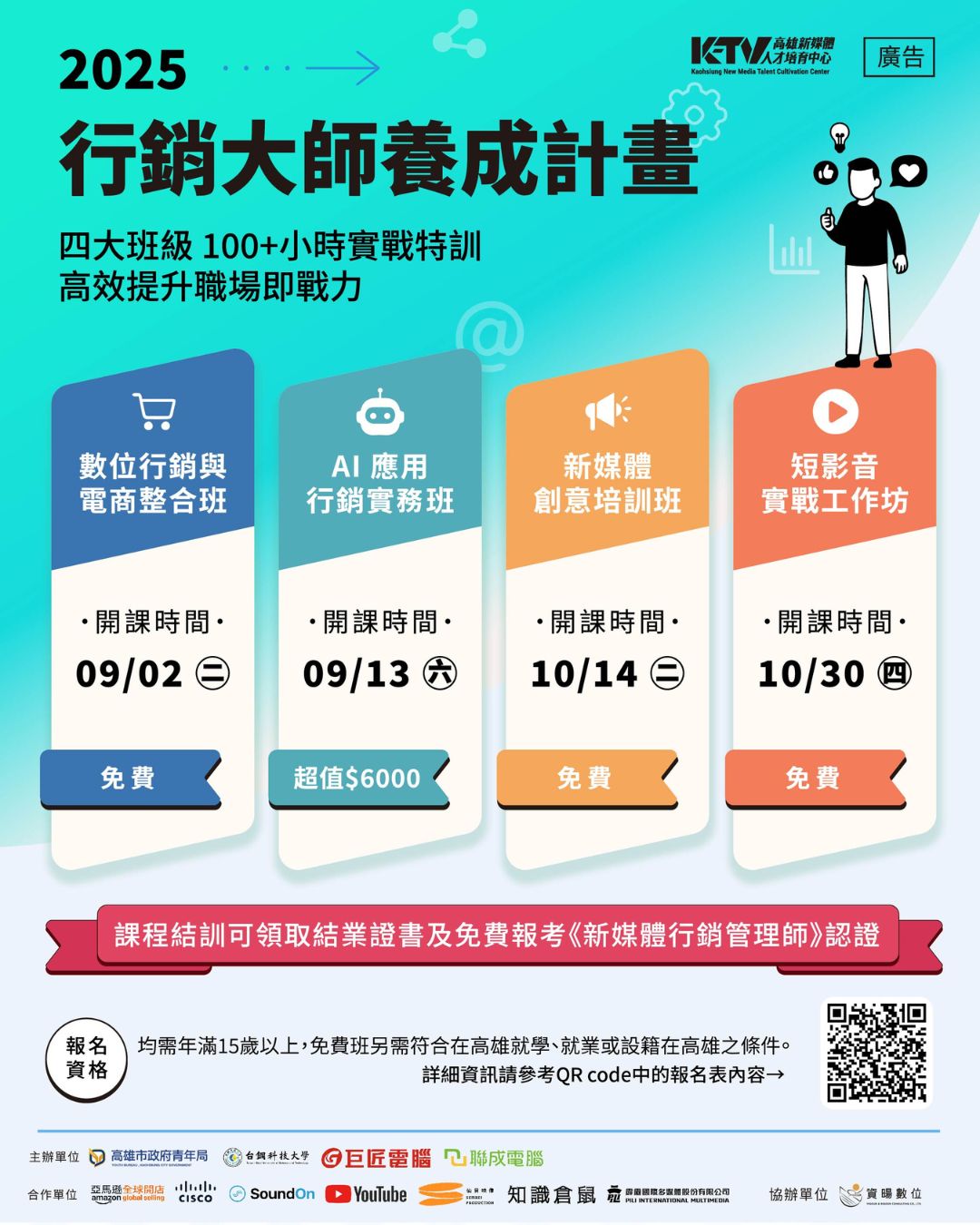 一、為提升青年新媒體專業職能,強化職場競爭力,本局今(114)年與台鋼科技大學、聯成電腦及巨匠電腦合作辦理第五屆「行銷大師養成計畫」,依不同主題內容分別開設「數位行銷與電商整合班」、「AI應用行銷實務班」、「新媒體創意培訓班」及「短影音實戰工作坊」等4個班別,並邀請YouTube、亞馬遜全球開店(Amazon GlobalSelling)及仙貝映象等知名品牌合作擔任課程總導師,結合實戰練習與扎實內容,協助學員精準學習、穩健累積新媒體應用技能。