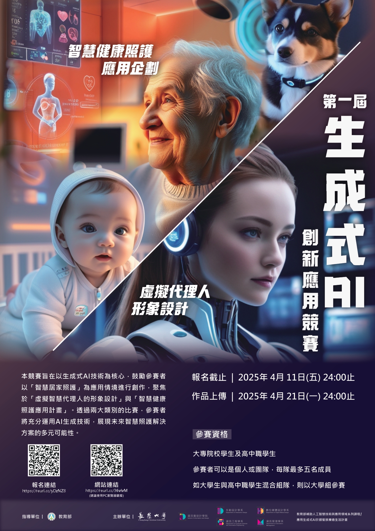 公告活動訊息如下:「『第一屆生成式AI智慧居家照護虛擬代理人創新應用競賽』自即日起至4月11日止開放網路報名,歡迎踴躍報名參賽,網站網址:https://reurl.cc/xN0ANL 』」。