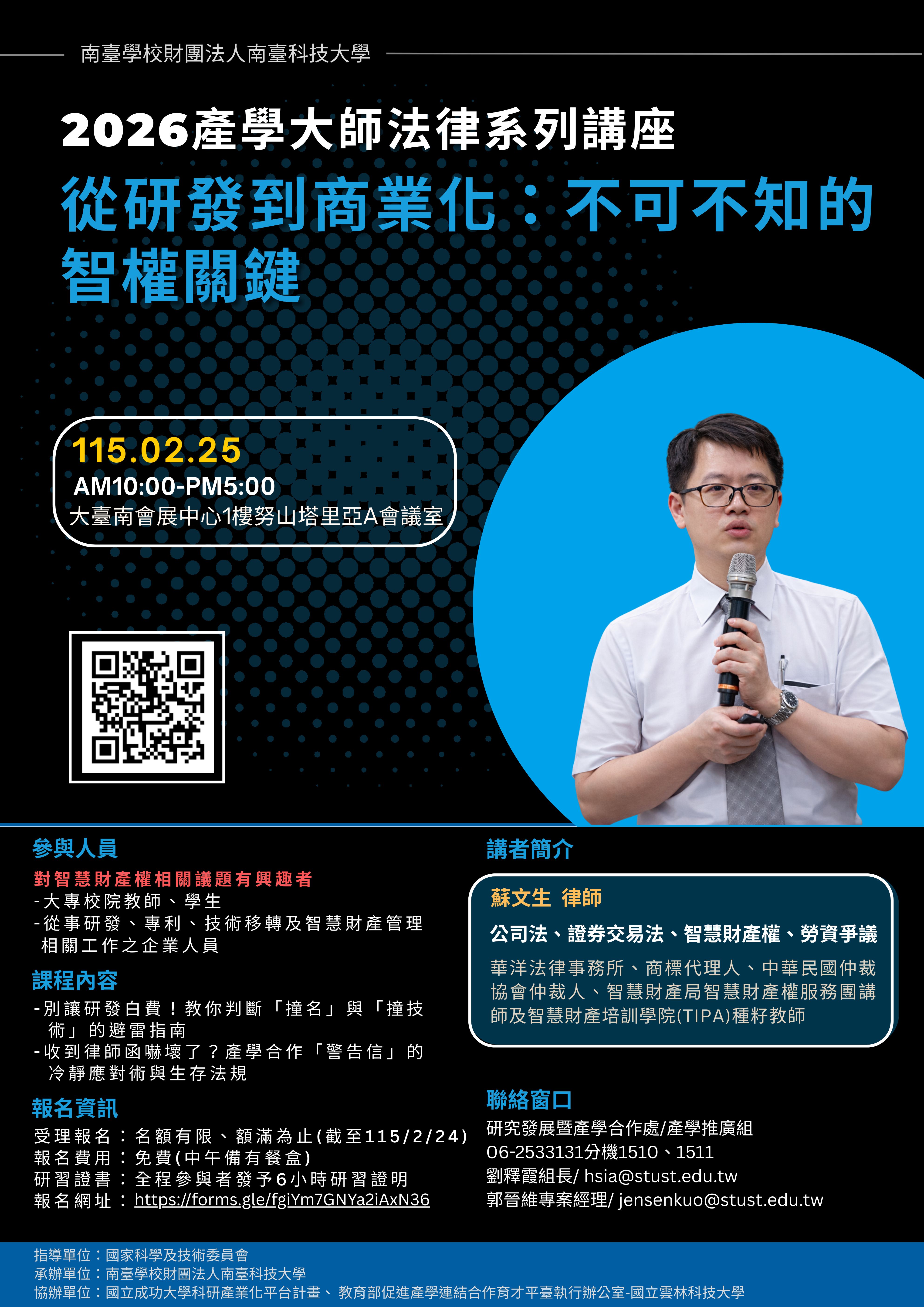 「2026產學大師法律系列講座-從研發到商業化:不可不知的智權關鍵」