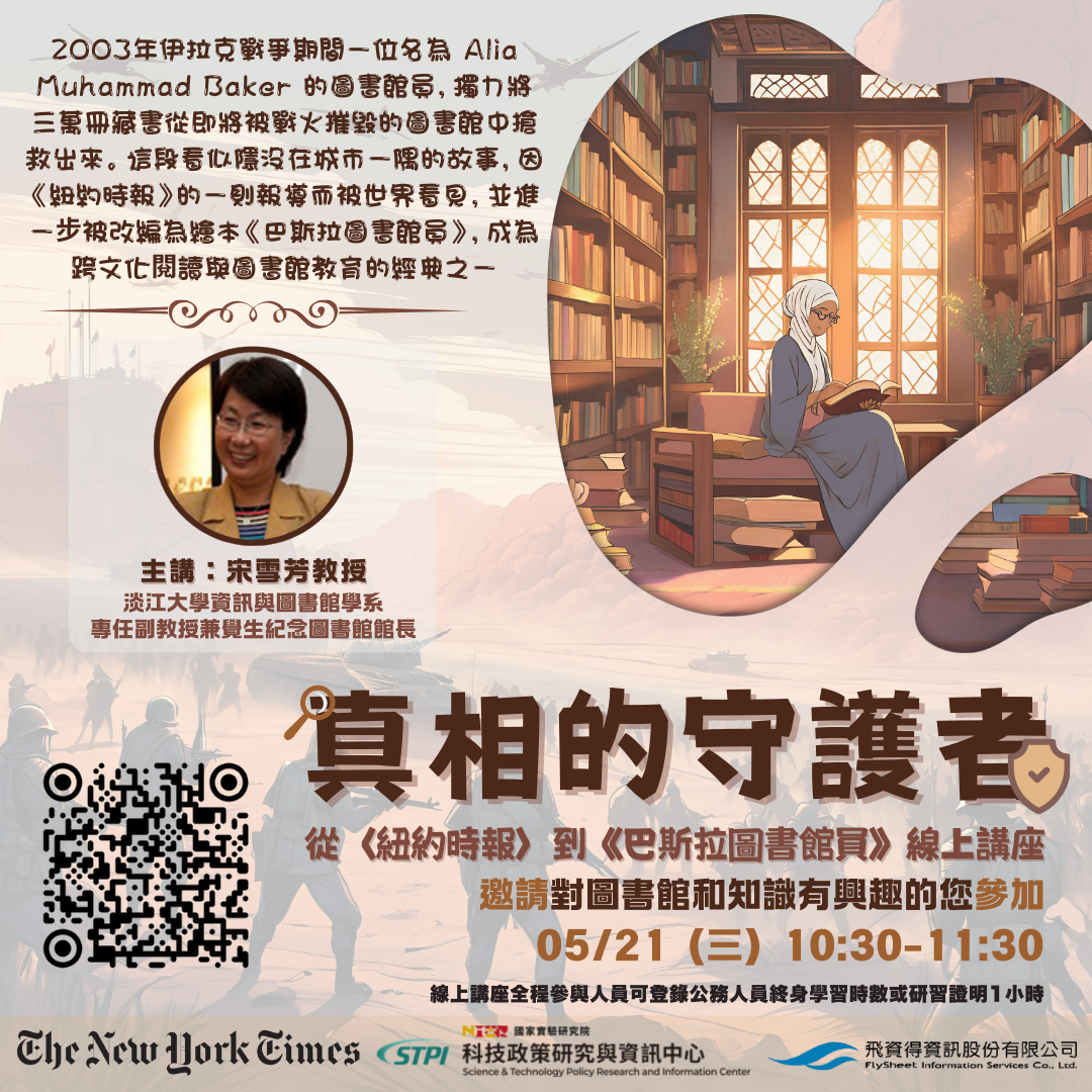 淡江大學館長宋雪芳教授研究兒童圖書館多年,因為兒童繪本《巴斯拉圖書館員》與《紐約時報》結緣,本次線上講座特別邀請宋教授分享這段歷程。