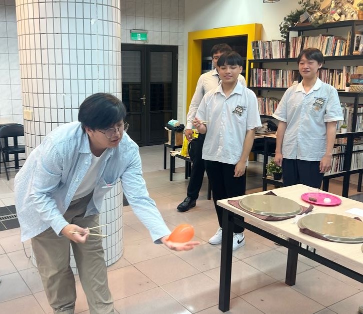 第二項「夾球接力—餐旅傳情球」,以抽籤決定使用的夾取工具進行接力賽跑,過程中不得讓物品掉落,模擬餐飲與飯店部門間的協作與流暢度,讓學生體會服務流程銜接的重要性。