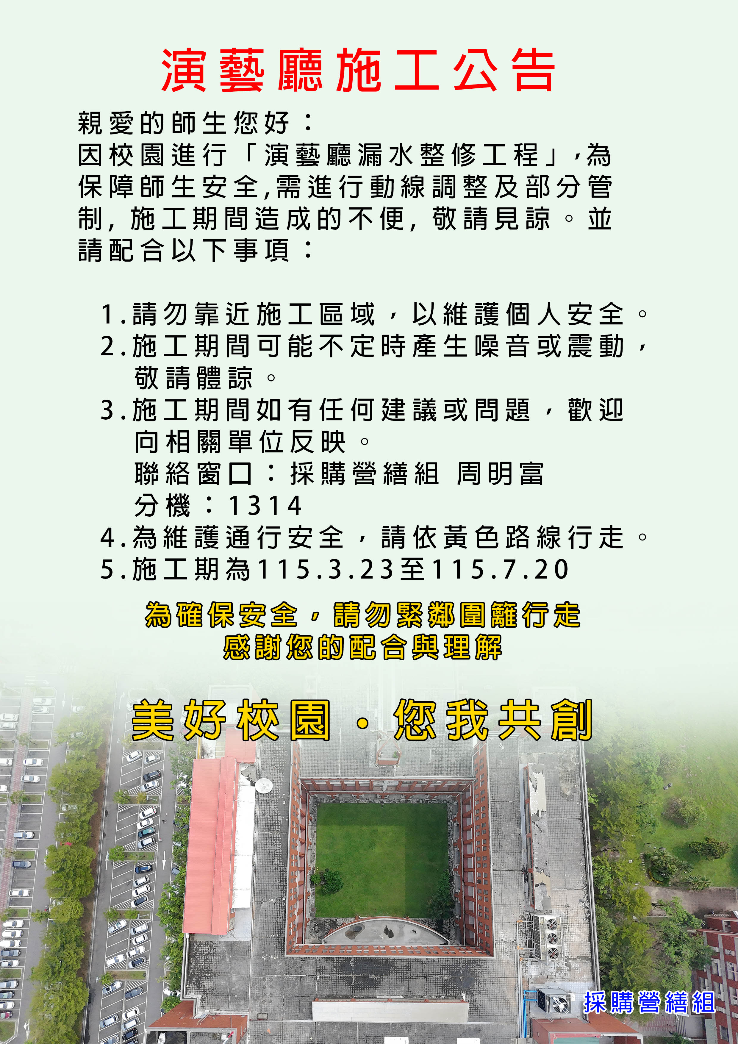 因校園進行「演藝廳漏水整修工程」,為保障師生安全,需進行動線調整及部分管制,施工期間造成的不便,敬請見諒。並請配合以下事項: