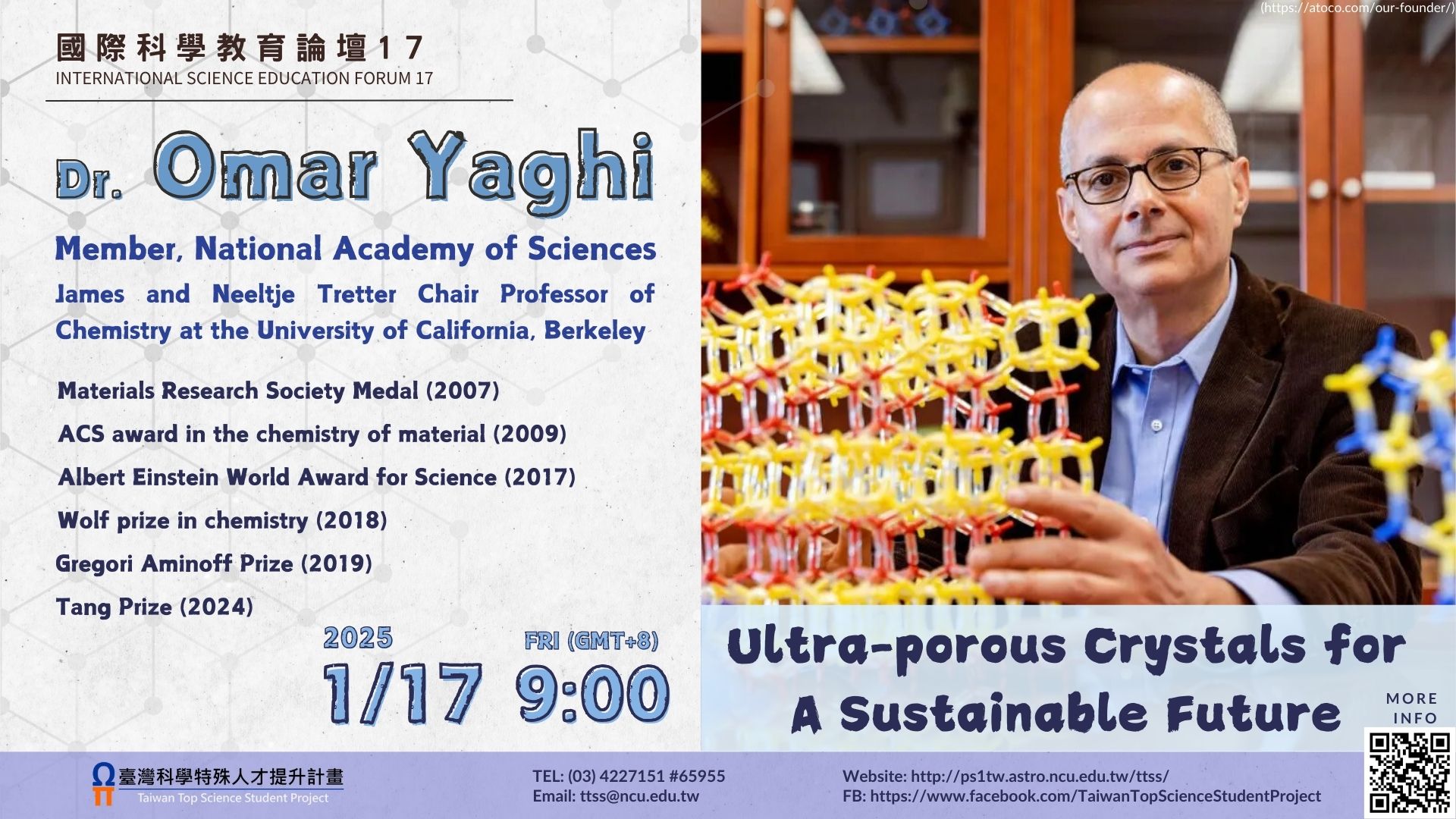 本校訂於114年1月17日辦理線上講座:《國際科學教育論壇系列17》—— 「Ultra-porous crystals for a sustainable future」,請惠予公告,並轉知貴校所屬師生踴躍報名參加,請查照。