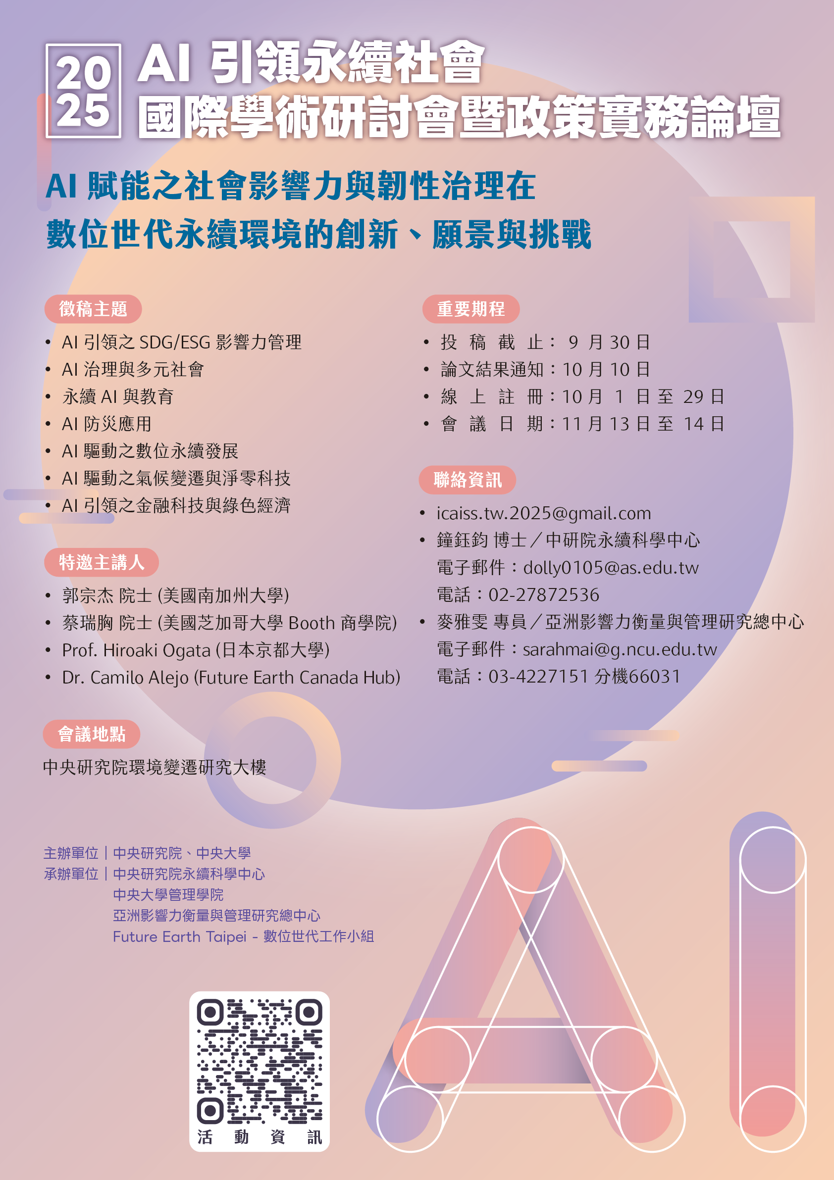 【徵稿訊息】國立中央大學辦理「2025 AI 引領永續社會國際學術研討會暨政策實務論壇」,歡迎有興趣之師生踴躍投稿