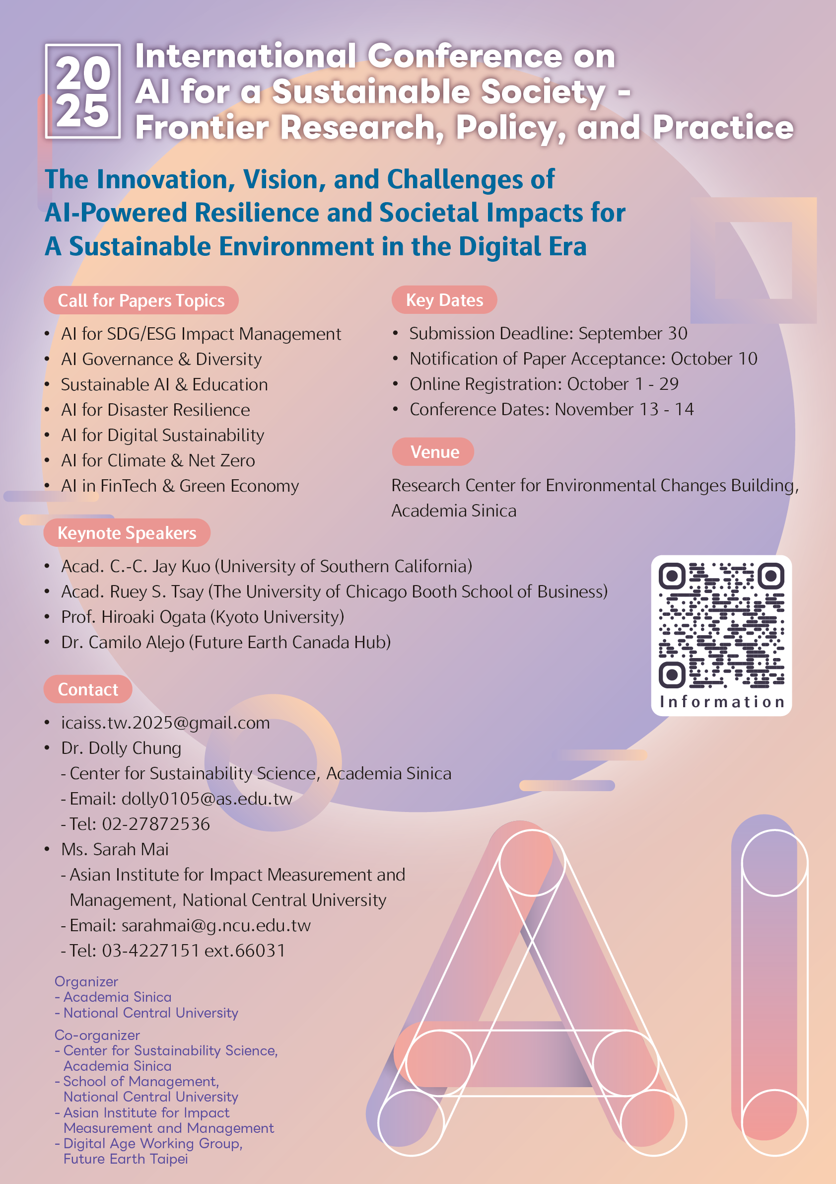 一、本校謹訂於2025年11月13日至14日假中央研究院舉辦「2025 AI 引領永續社會國際學術研討會暨政策實務論壇」,藉由國際學者與實務專家對話,共同探討人工智慧於永續社會發展之應用與政策實踐。