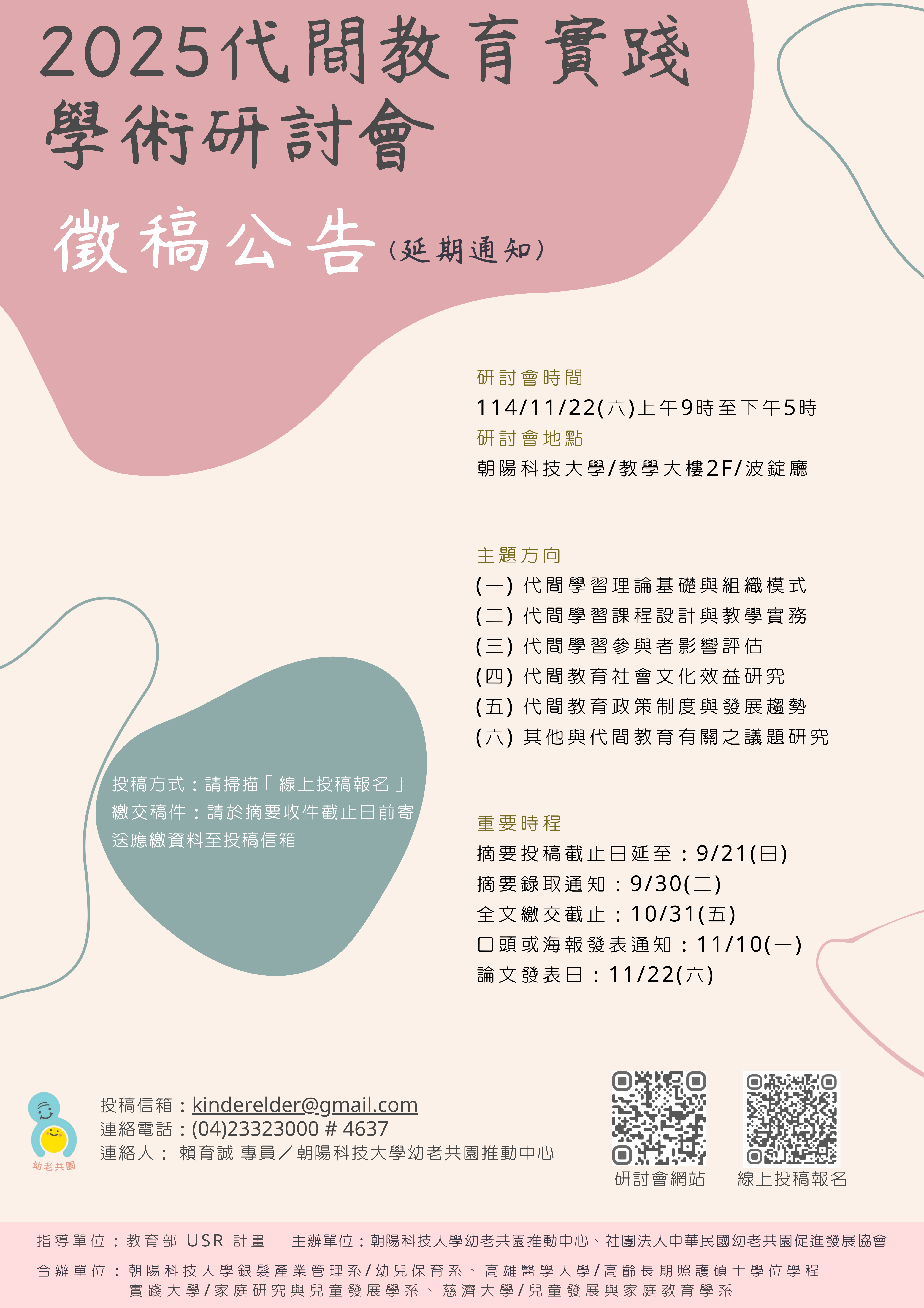 【徵稿訊息】朝陽科技大學辦理「2025代間教育實踐學術研討會」摘要投稿報名截止日期延長,歡迎有興趣之師生踴躍投稿