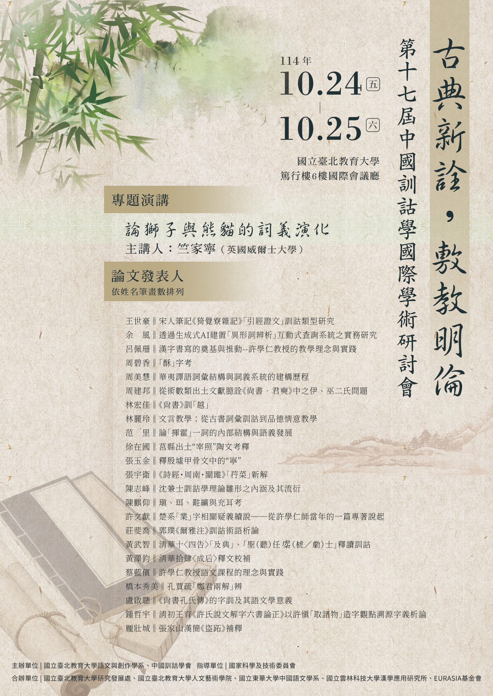 主旨:本校語文與創作學系及中國訓詁學會共同舉辦「古典新詮,敷教明倫——第十七屆中國訓詁學國際學術研討會」。