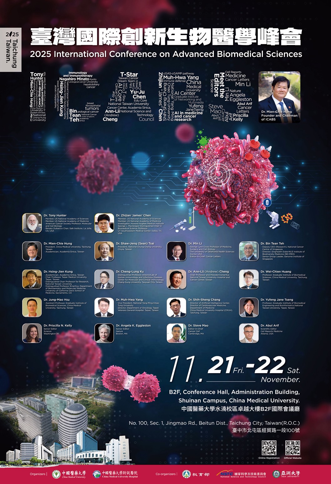 【活動訊息】中國醫藥大學舉辦「2025 International Conference on Advanced Biomedical Sciences臺灣國際創新生物醫學峰會」,歡迎有興趣者踴躍報名