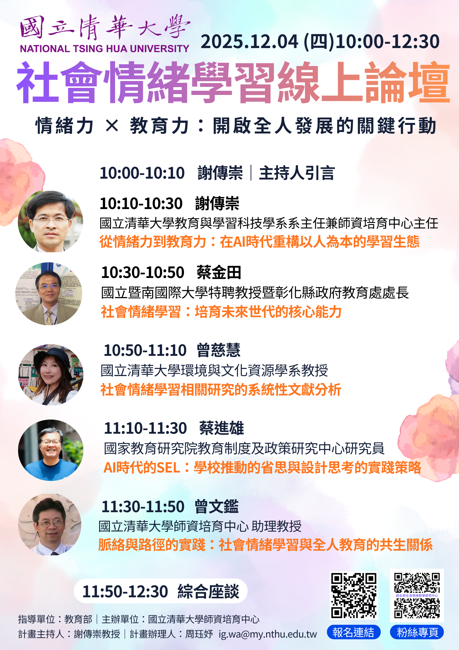 【活動訊息】國立清華大學辦理「社會情緒學習線上論壇-情緒力 × 教育力:開啟全人發展的關鍵行動」線上論壇