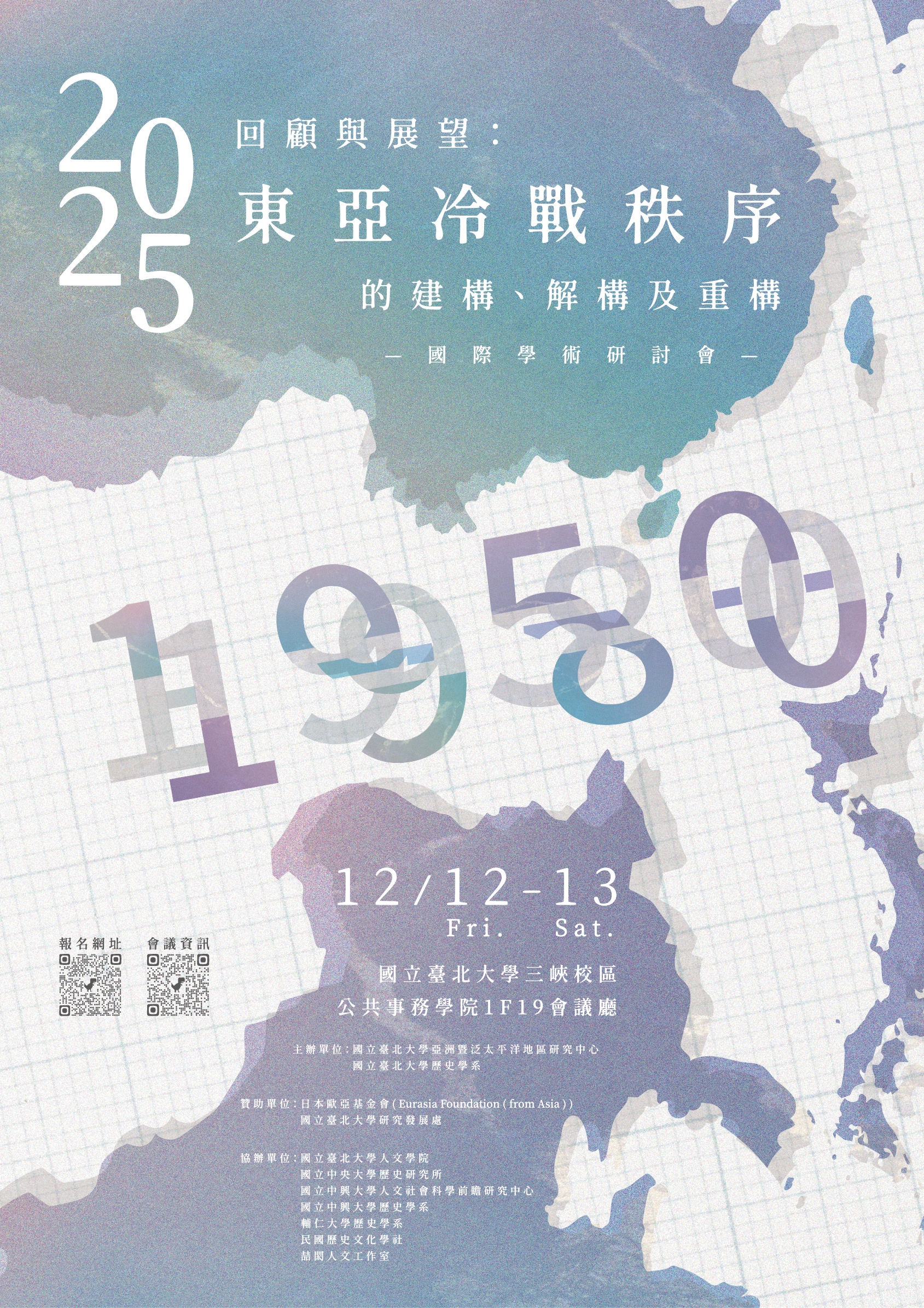 主旨:檢送本校亞洲暨泛太平洋地區研究中心於2025年12月12日(五)、13日(六)舉辦之「回顧與展望:東亞冷戰秩序的建構、解構及重構國際學術研討會」活動資訊。
