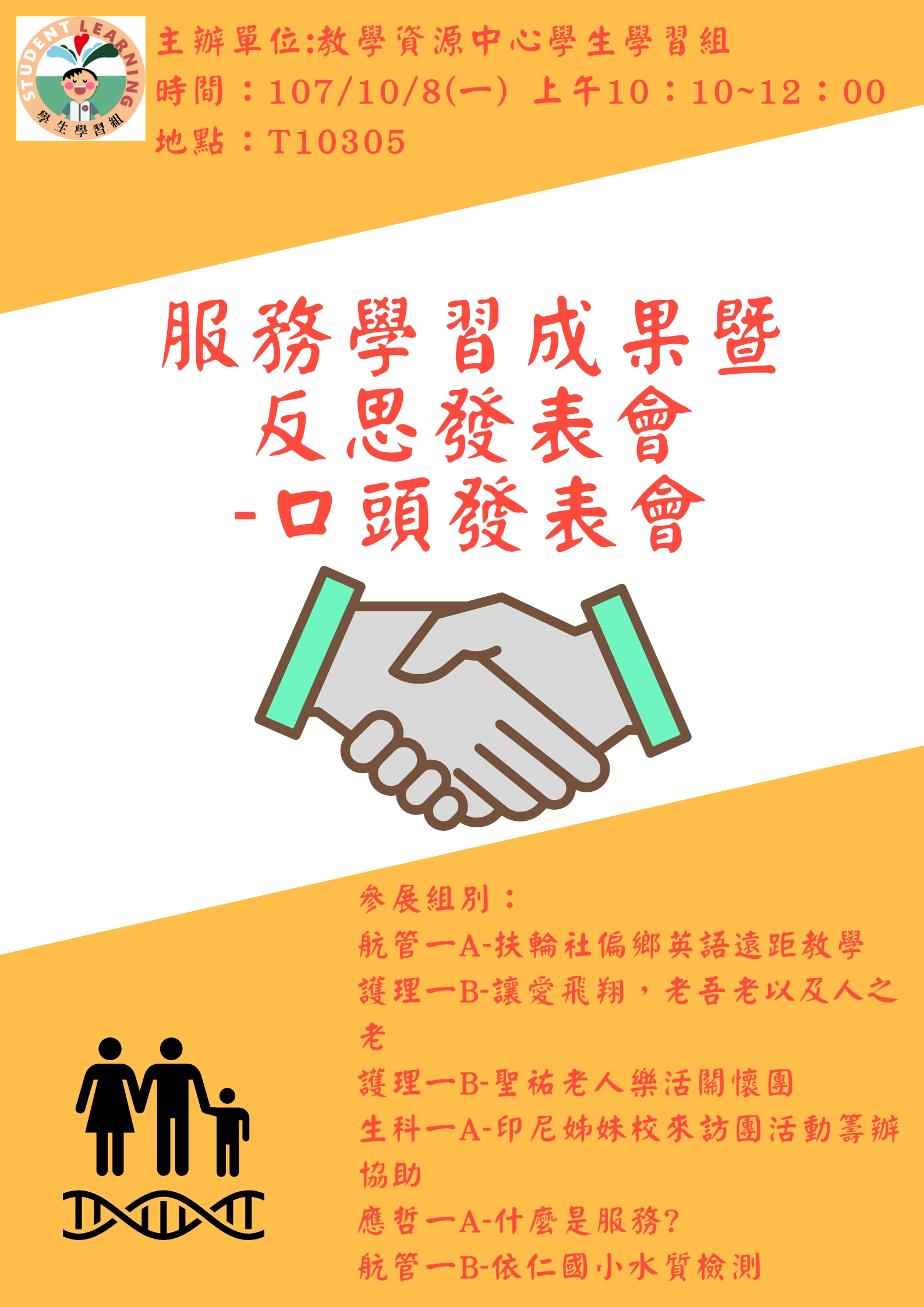 - 經過106學年度第二學期服務學習成果靜態海報展複審結果,遴選出6組績優組別,於107學年度第一學期進行決選,藉由學生服務成果的展現,提升各班級對服務學習課程的反思與經驗分享,增進團隊榮譽感,及提供學習與交流的平台。
