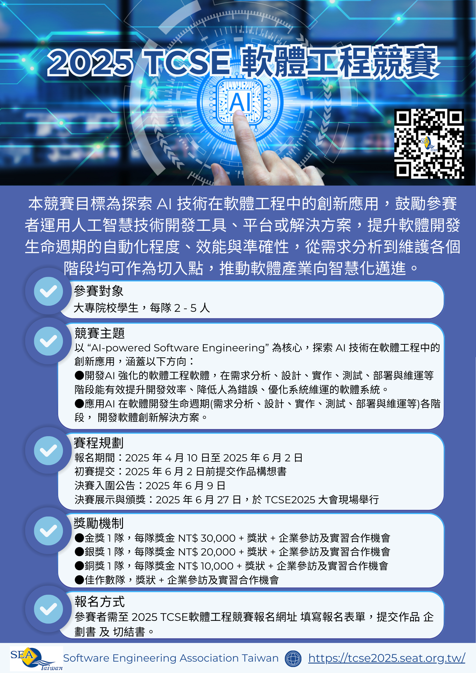 八、TCSE 2025軟體工程競賽相關資訊,請逕至參閱https://tcse2025.seat.org.tw/