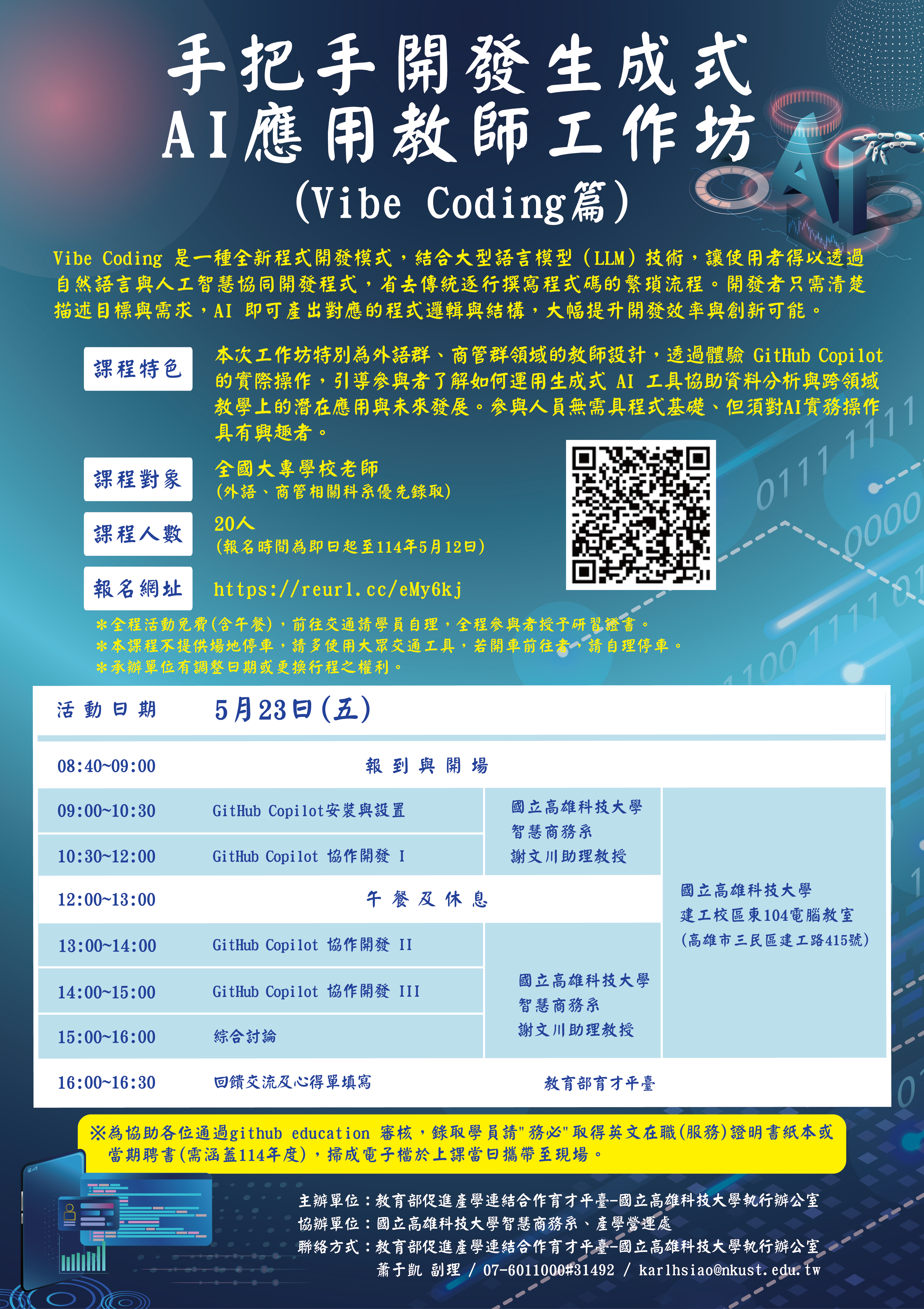 一、本次工作坊特別為外語群、商管群領域的教師設計,透過體驗 GitHub Copilot 的實際操作,引導參與者了解如何運用生成式 AI 工具協助資料分析與跨領域教學上的潛在應用與未來發展。參與人員無需具程式基礎、但須對AI實務操作具有興趣者。