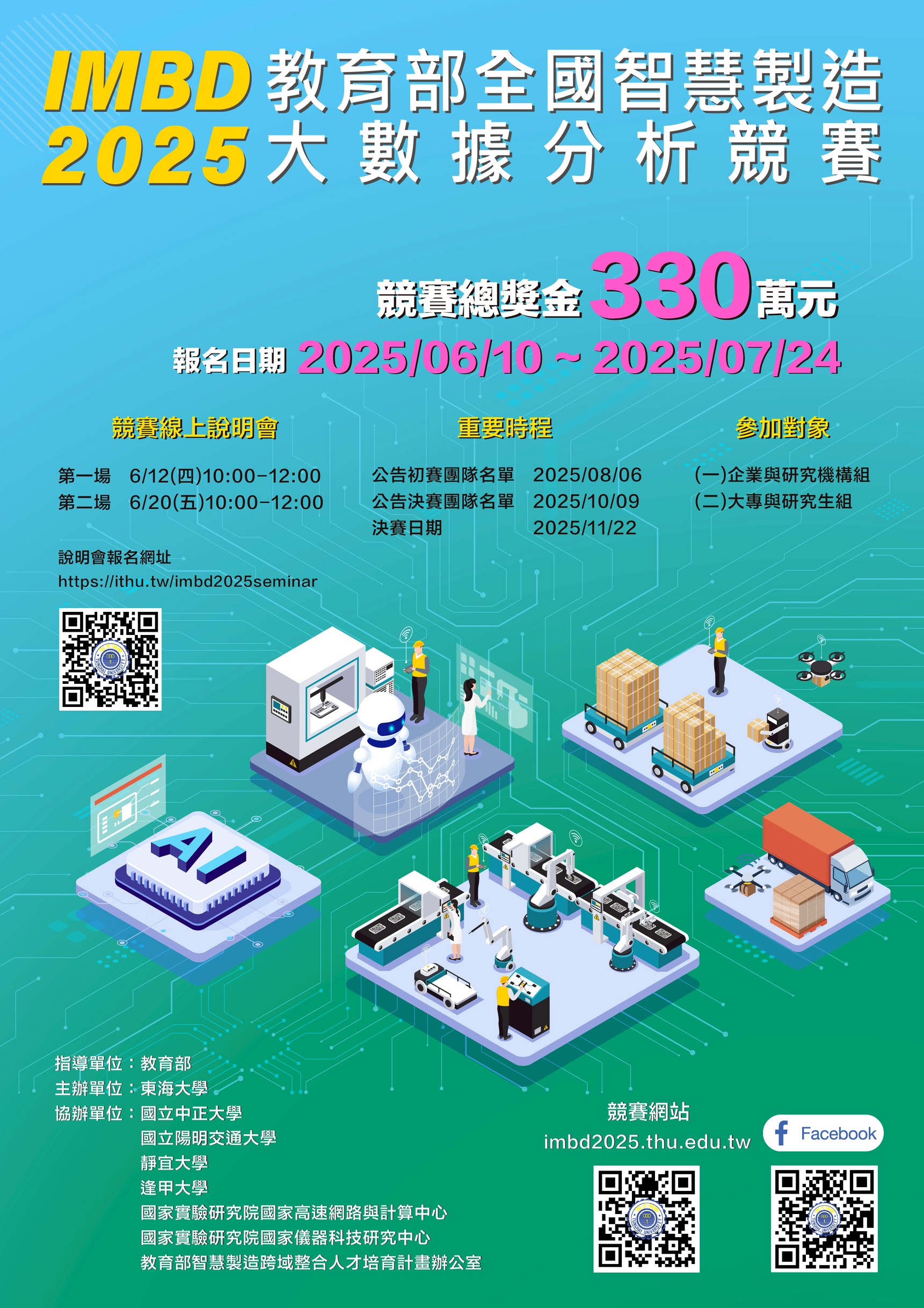 一、東海大學承辦教育部指導舉辦之「2025全國智慧製造大數據分析競賽」,競賽目的為推廣「人工智慧」與「大數據分析」相關技術與智慧製造之應用,並培育國內相關領域人才。競賽總獎金高達新臺幣330萬,敬邀貴校數據分析高手報名參賽。