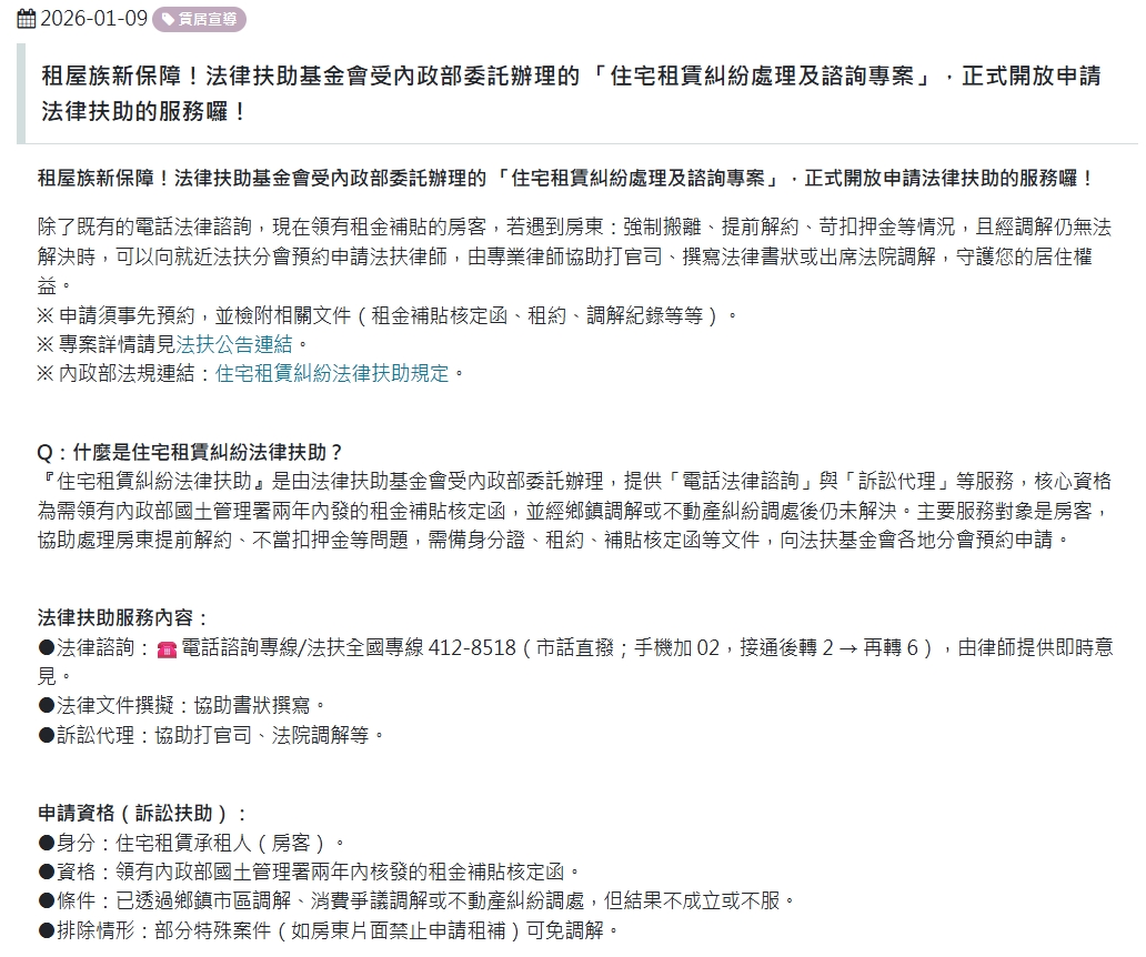 內政部委託財團法人法律扶助基金會(下稱法扶基金會)辦理辦理115年度住宅租賃糾紛處理及諮詢業務