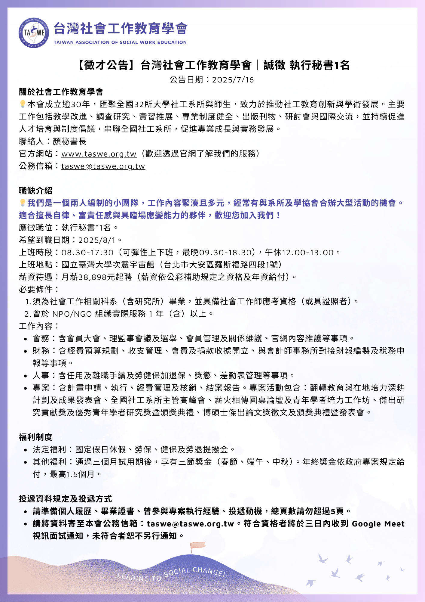 【徵才】台灣社會工作教育學會徵聘執行秘書1名