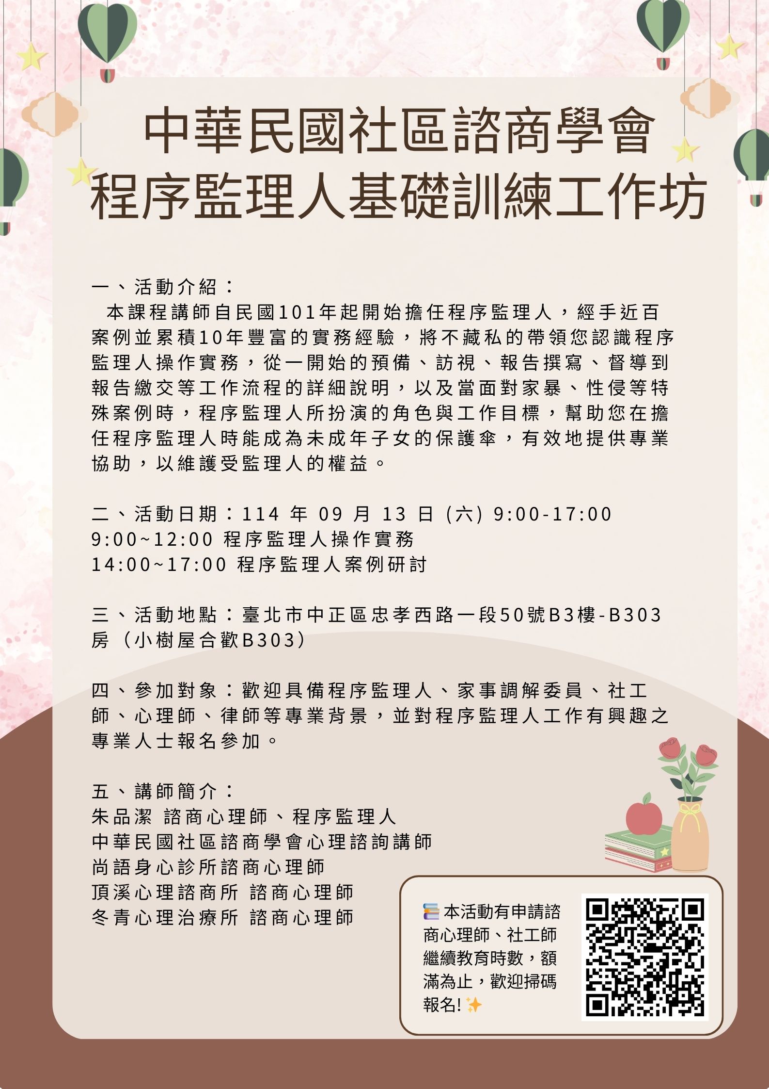 【工作坊】中華民國社區諮商學會辦理程序監理人基礎訓練工作坊