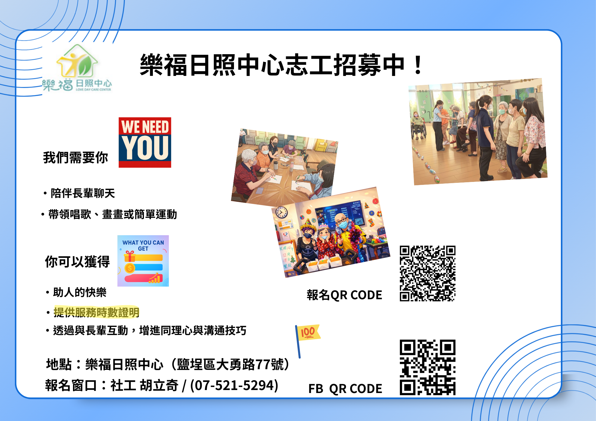 1. 服務內容:協助長輩參與團體活動、陪同聊天與傾聽、協助簡單生活照顧(如飲水提醒)
