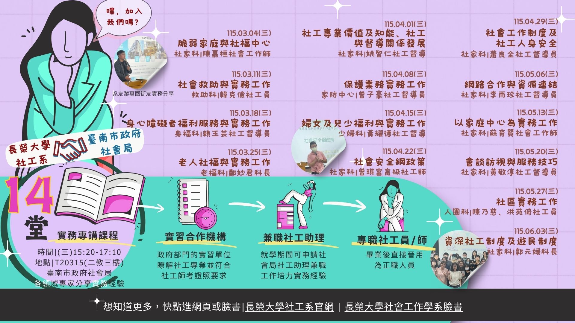 2026年實務專講活動已正式啟動,課程安排於每週三 15:20–17:10(第8–9節),地點為第二教學大樓3樓(T20315)。本課程邀請臺南市政府社會局各科室與實務單位專家分享第一線經驗,並特別邀請社會工作及家庭福利科 郭元媛科長(主題:資深社工制度及遊民制度)、老人福利科 鄭妙君科長(主題:老人社福與實務工作),以及社福中心區主任、資深督導社工師蒞臨交流,帶領同學理解制度與實務現場的銜接,深化專業視野與職涯準備。歡迎同學與老師們共同參與。