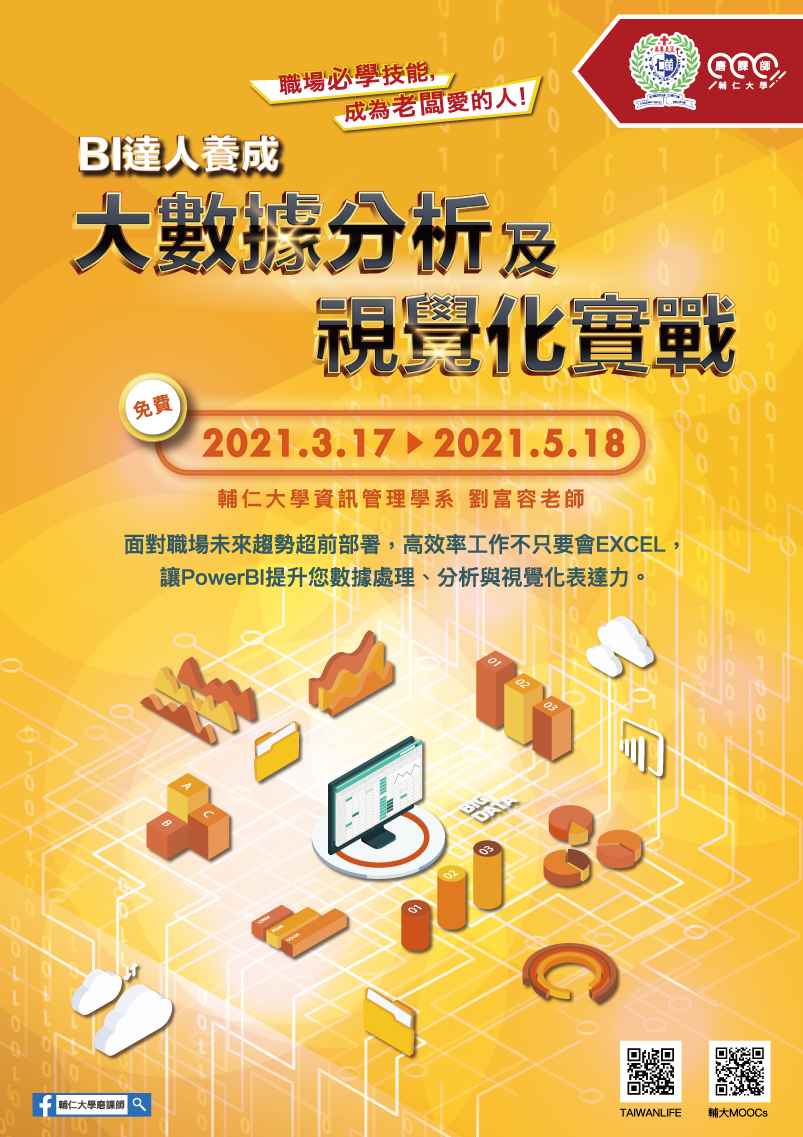 說明:即日起於平台開設「BI達人養成─大數據分析及視覺化實戰(2021春季班)」磨課師線上課程,皆可免費註冊報名,歡迎有興趣之師生踴躍報名參加。